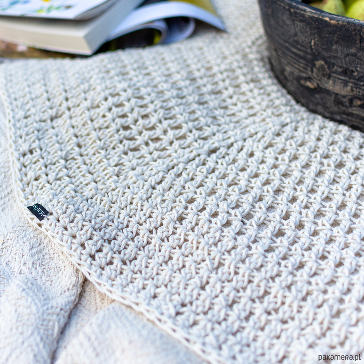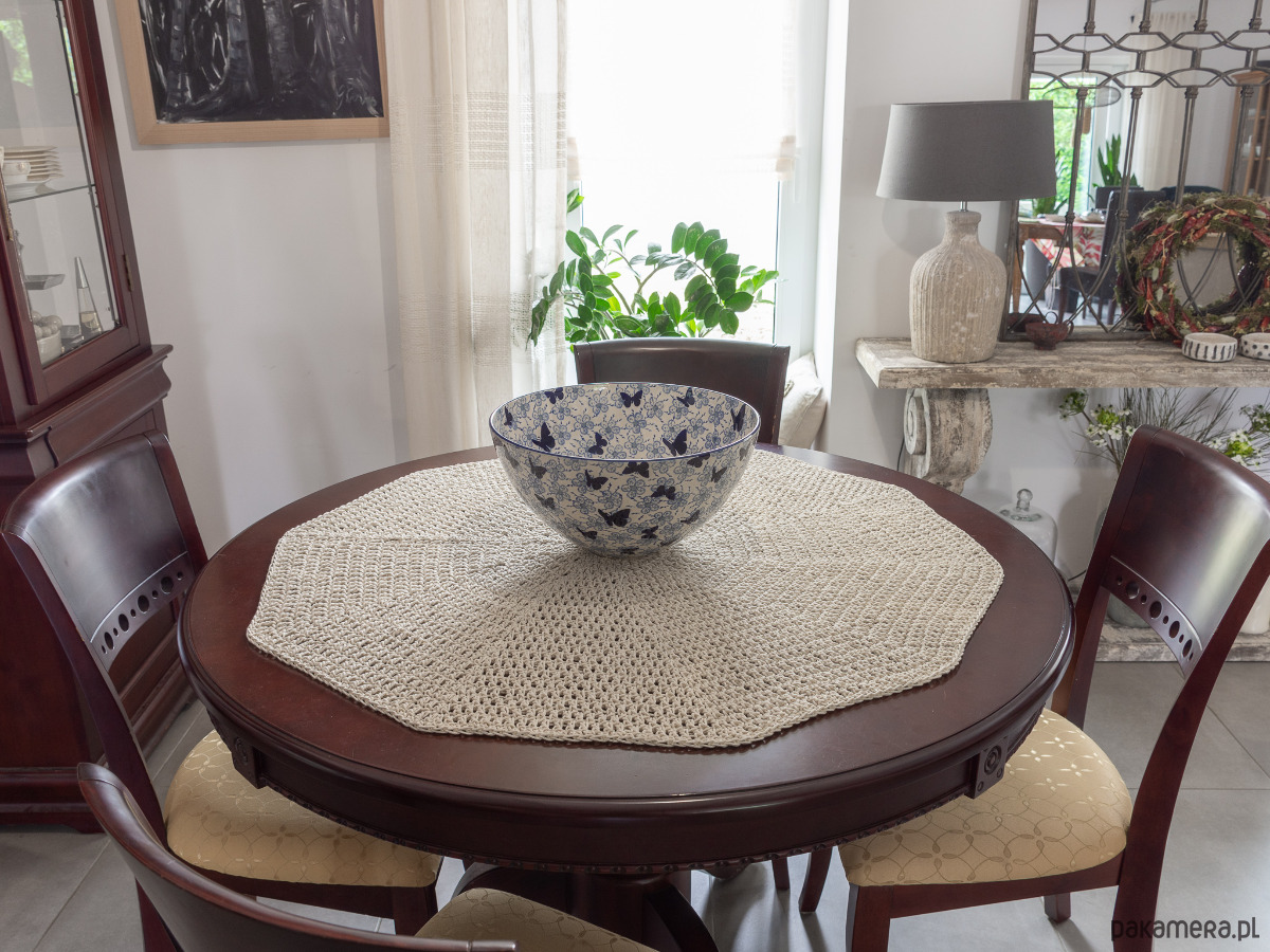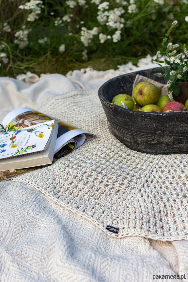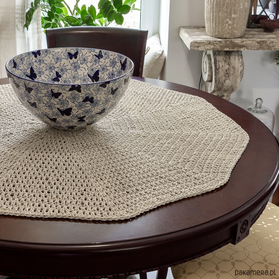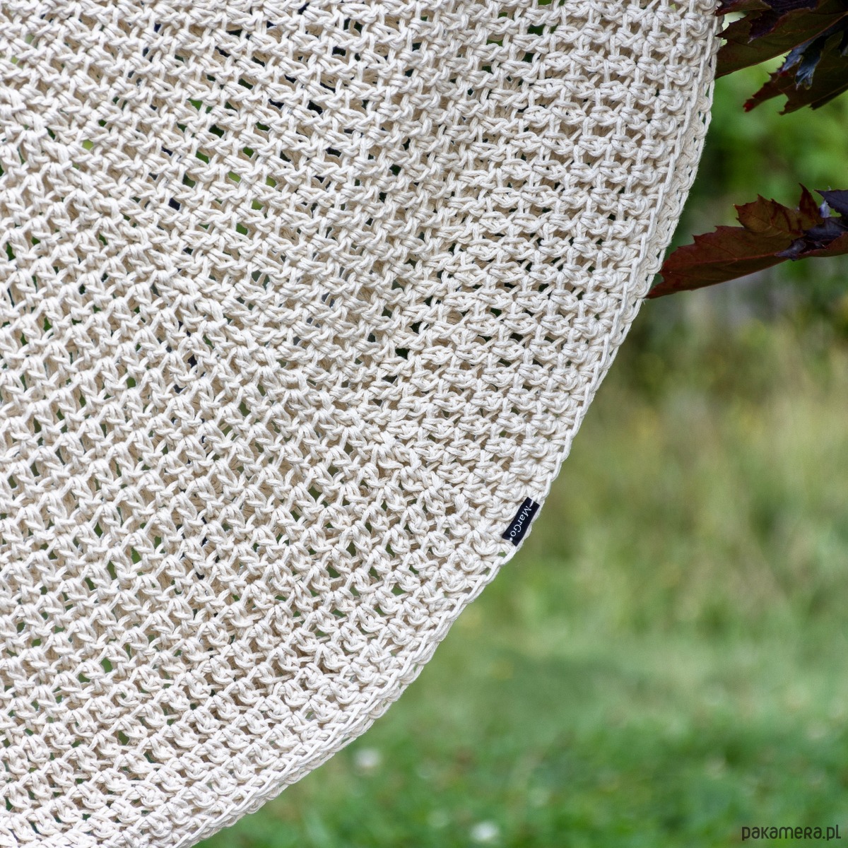 Serweta z bawełnianego 2 mm sznurka w kolorze natura zbliżony do ecru. Średnica serwety 100 cm.