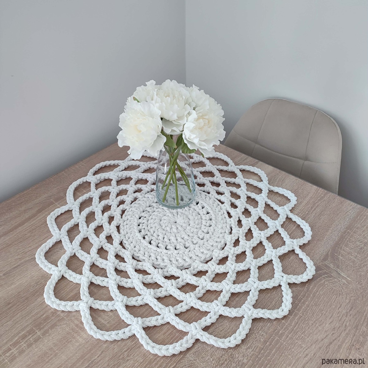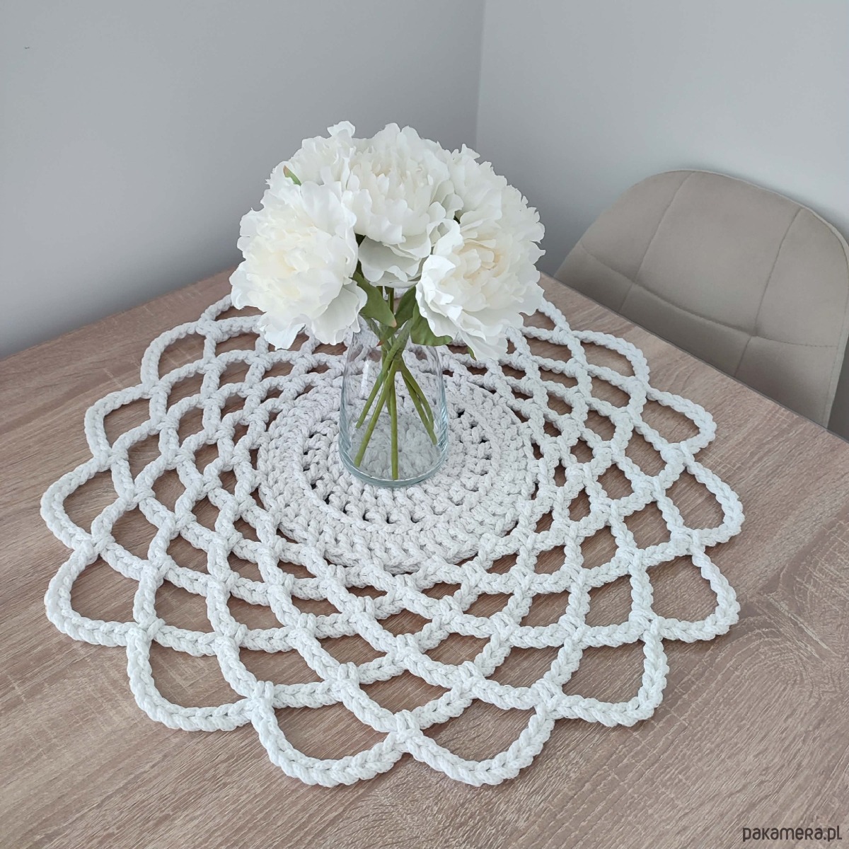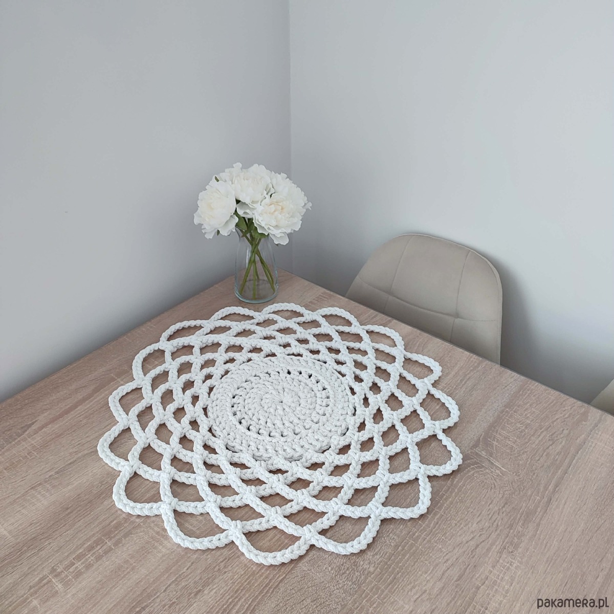 Serweta o średnicy 55cm, wykonana metodą szydełkowania z polskiego sznurka bawełnianego 5mm.