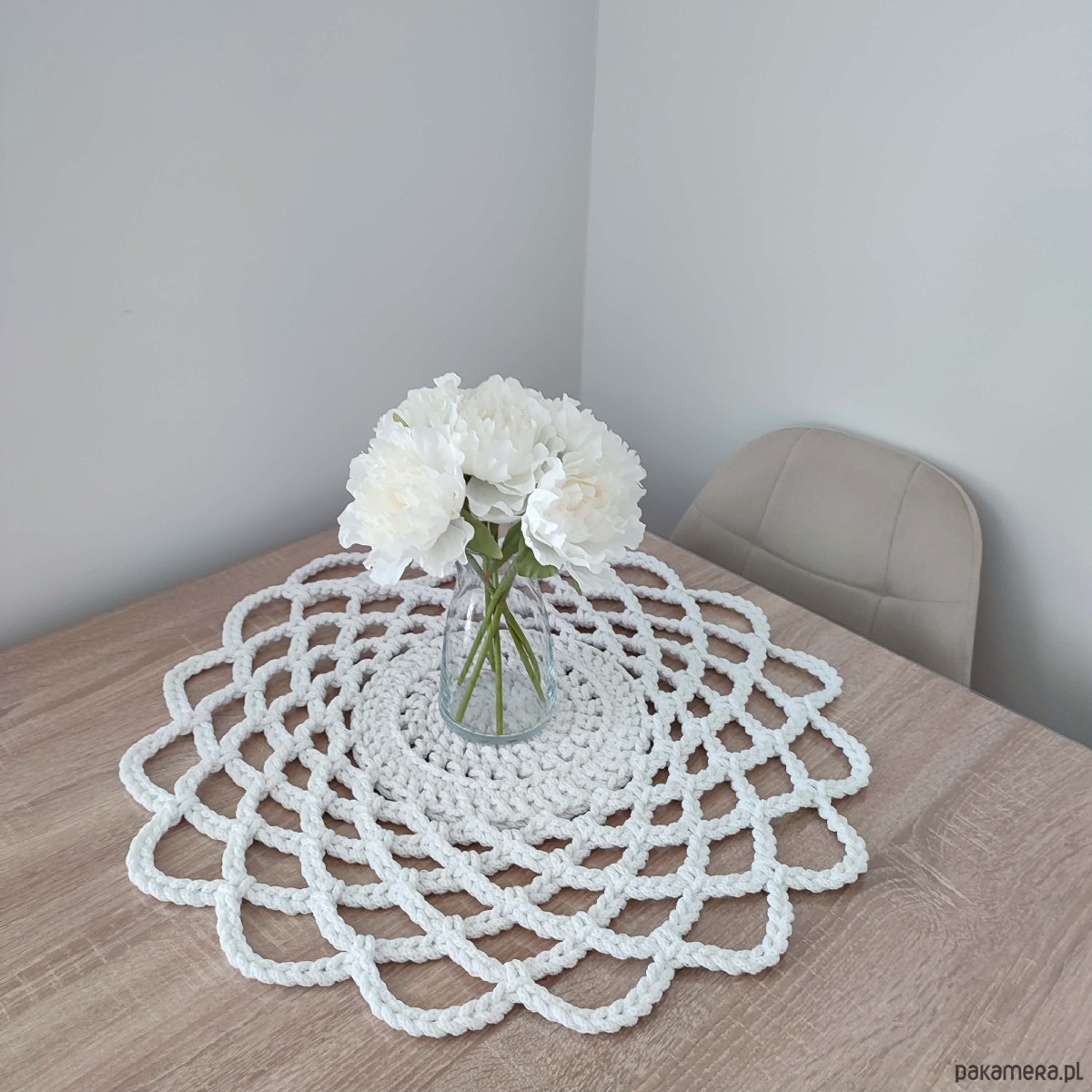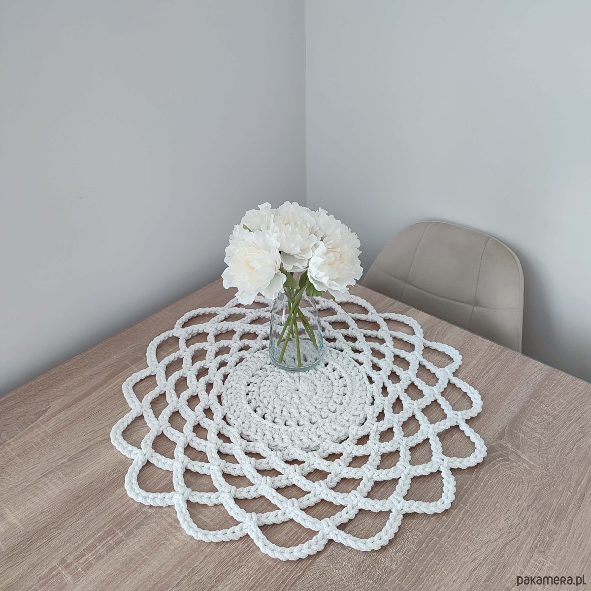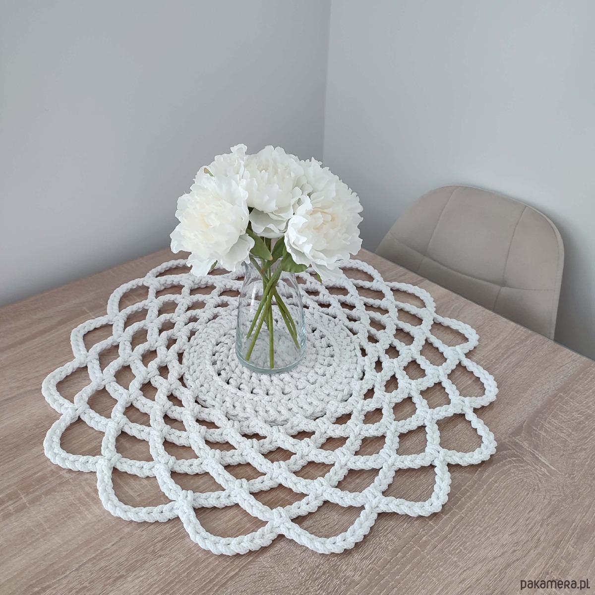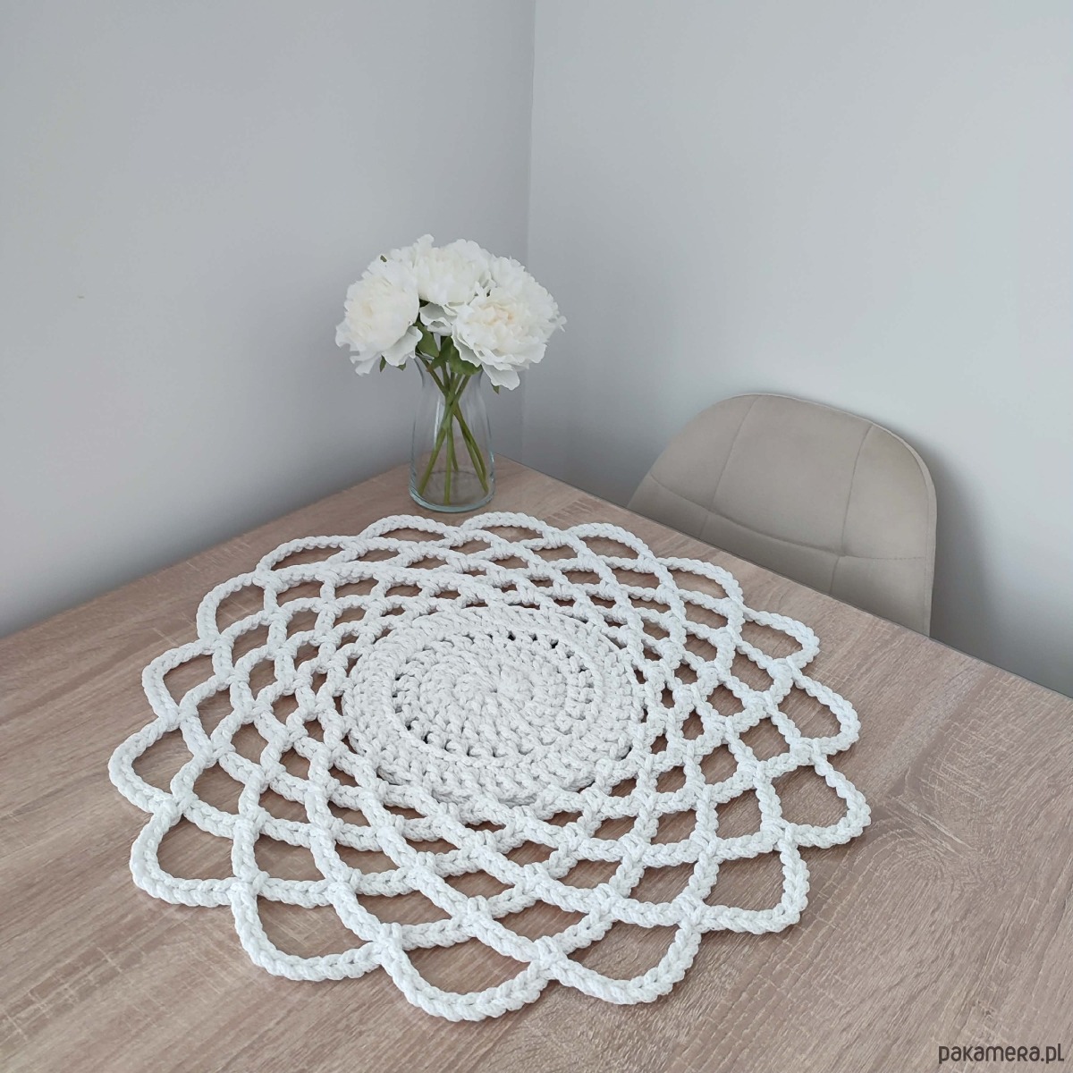 Serweta o średnicy 55cm, wykonana metodą szydełkowania z polskiego sznurka bawełnianego 5mm.
