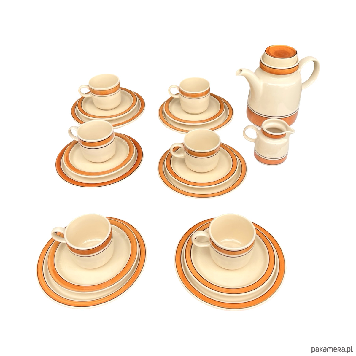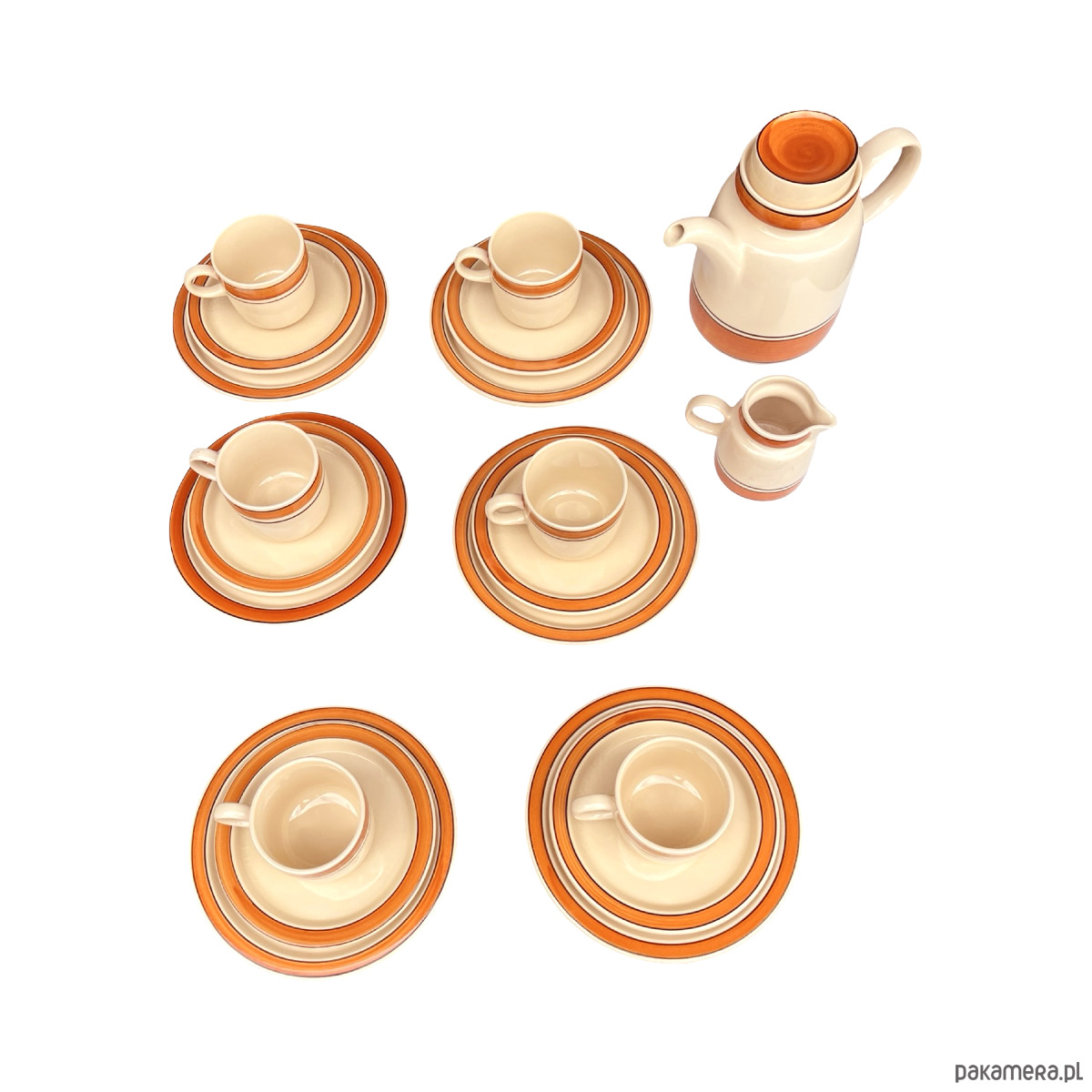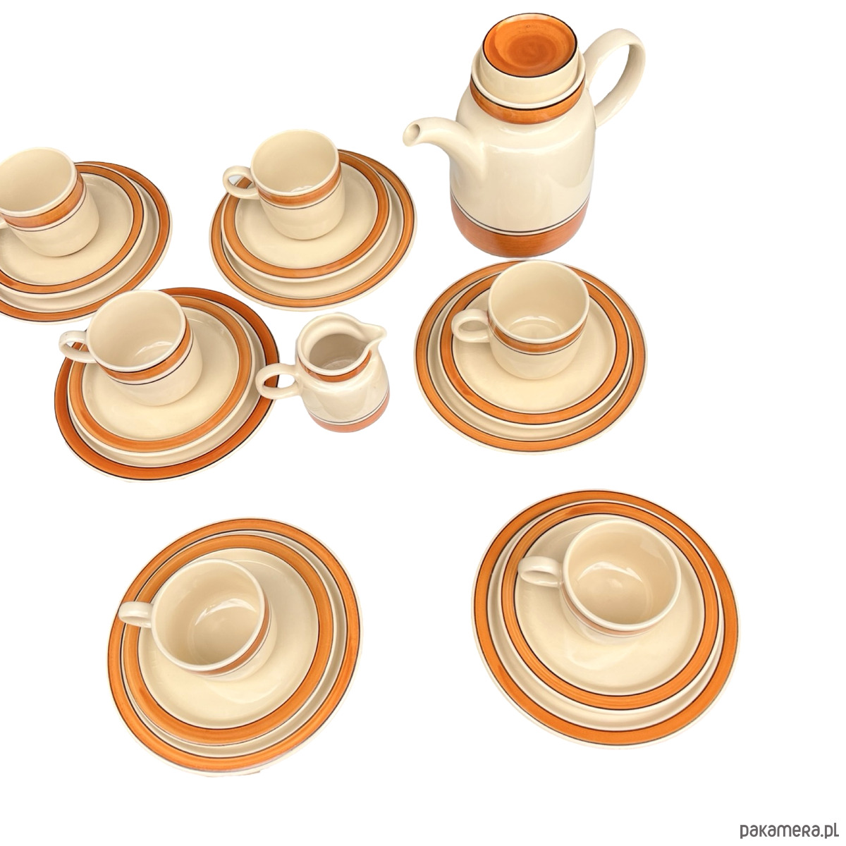 Stylowy zestaw kawowy marki Melitta z lat 70., wykonany z wysokiej jakości ceramiki. Utrzymany w typowej dla epoki palecie barw – beżowo-pomarańczowej z delikatnymi, brązowymi akcentami – doskonale oddaje klimat niemieckiego wzornictwa retro.