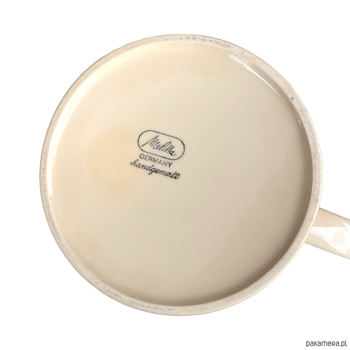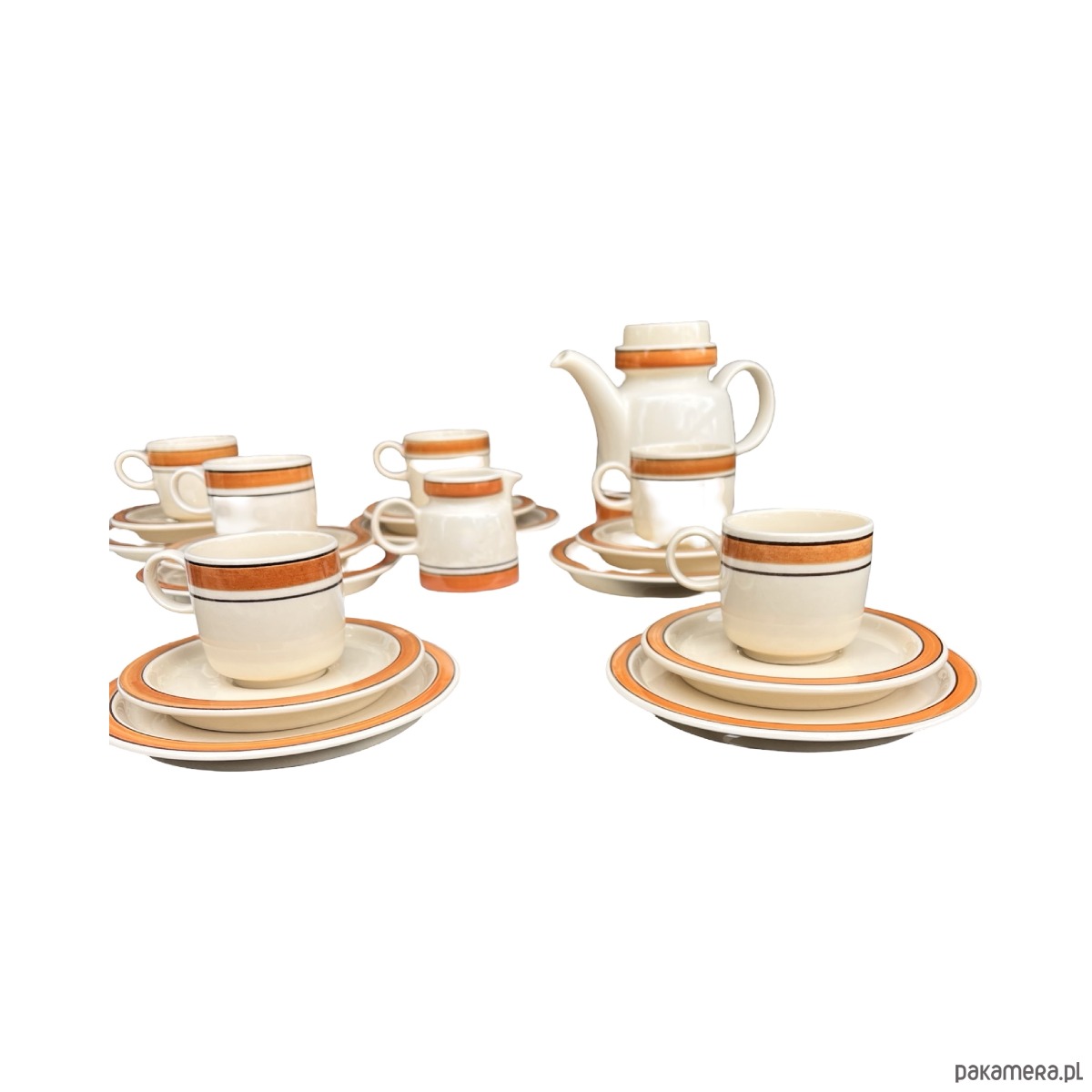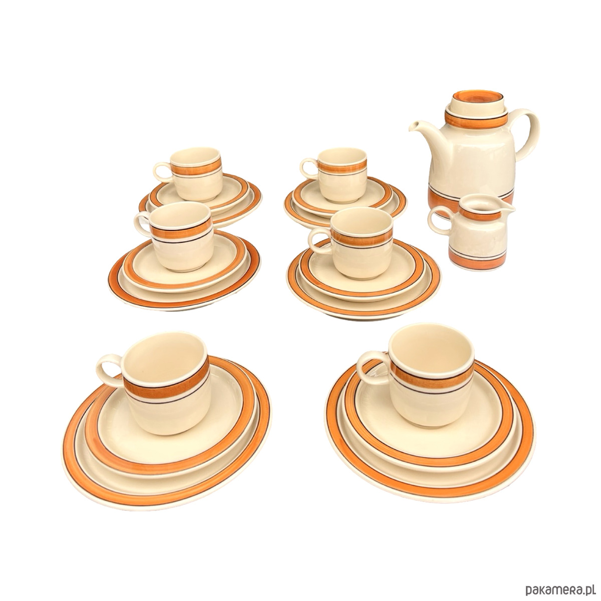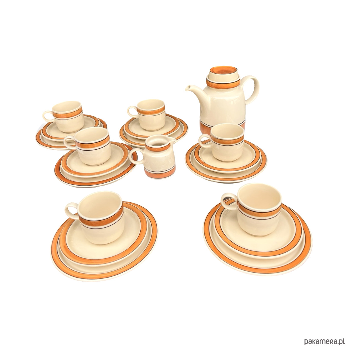 Stylowy zestaw kawowy marki Melitta z lat 70., wykonany z wysokiej jakości ceramiki. Utrzymany w typowej dla epoki palecie barw – beżowo-pomarańczowej z delikatnymi, brązowymi akcentami – doskonale oddaje klimat niemieckiego wzornictwa retro.