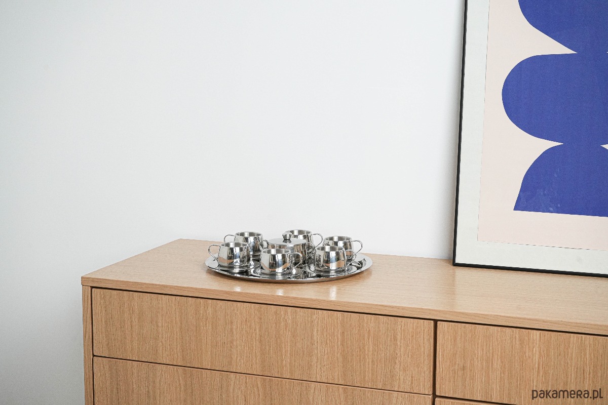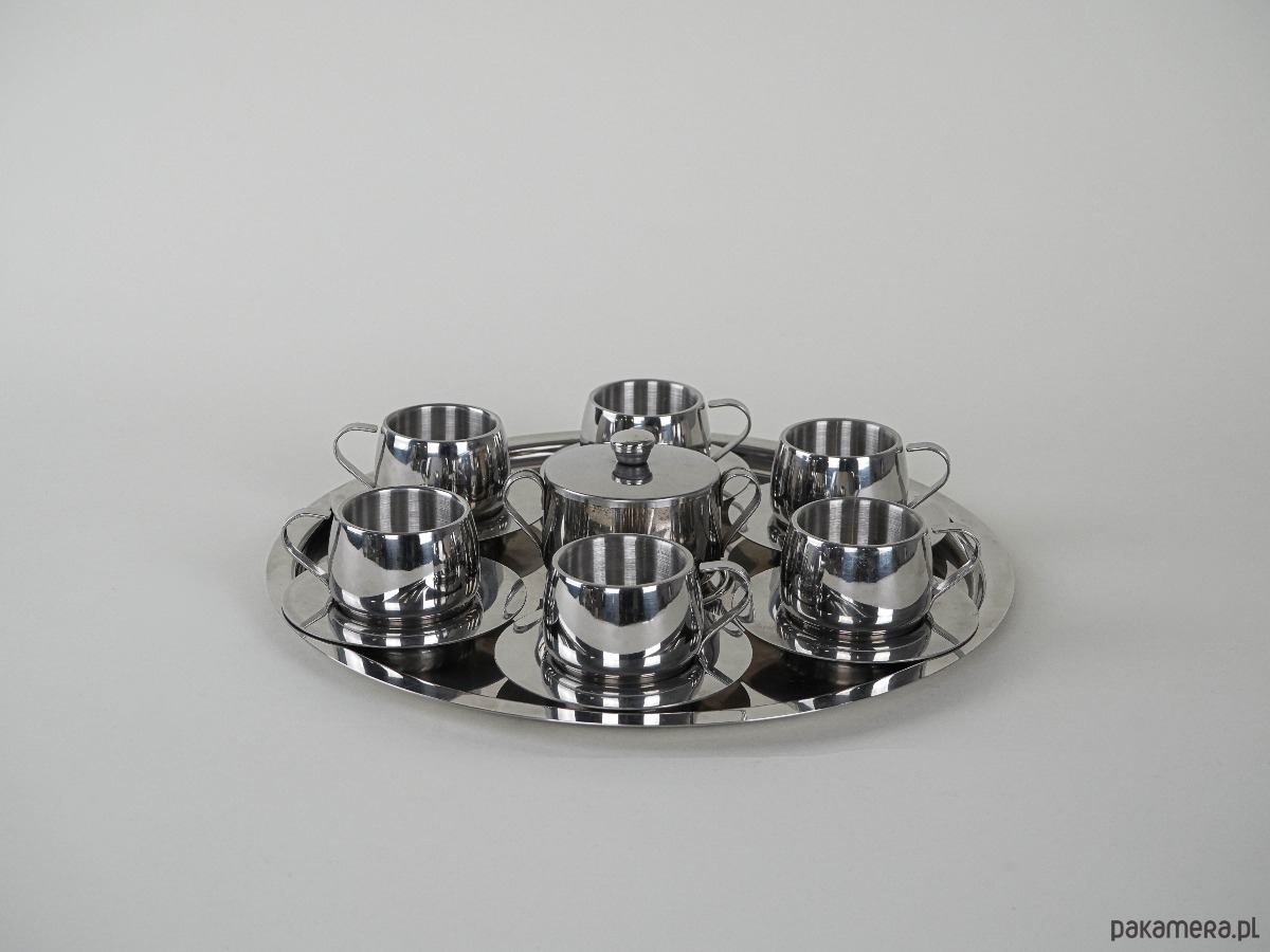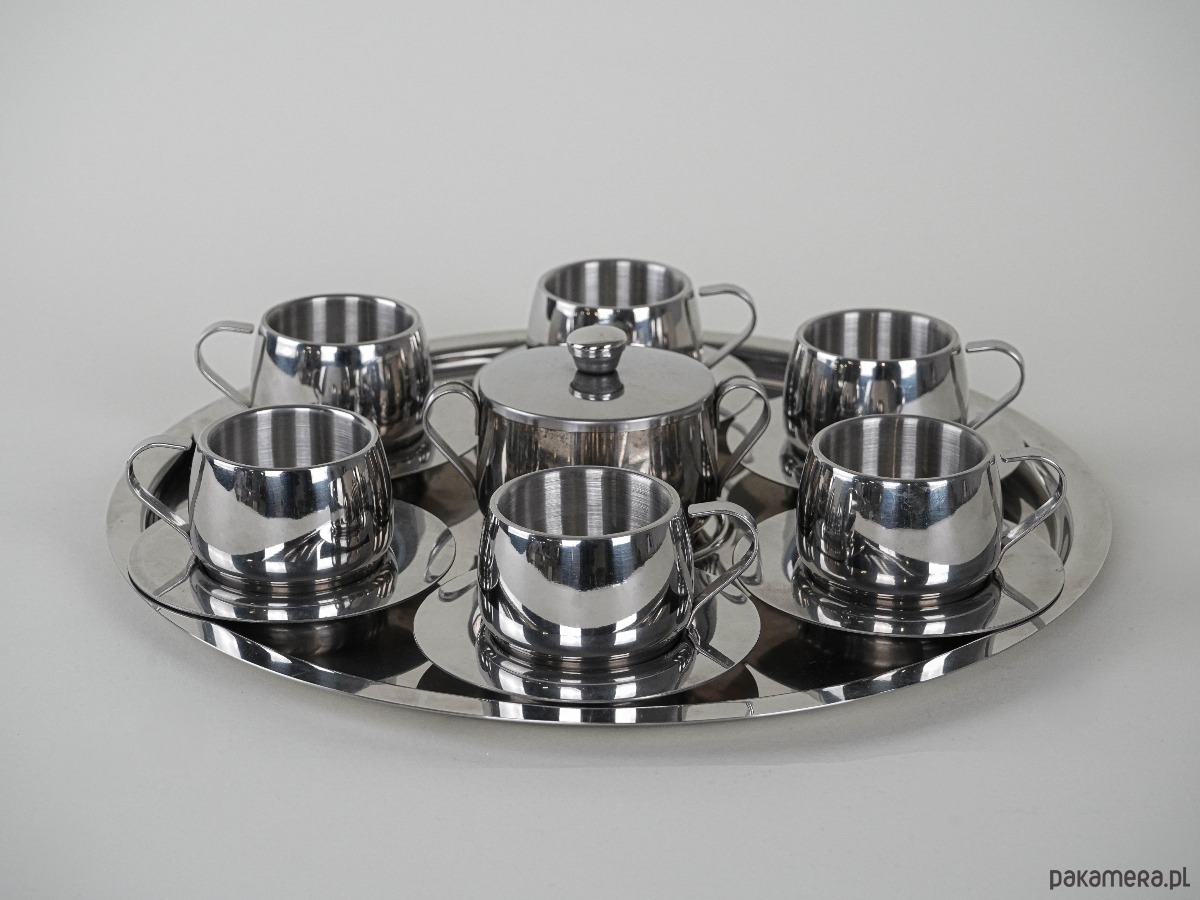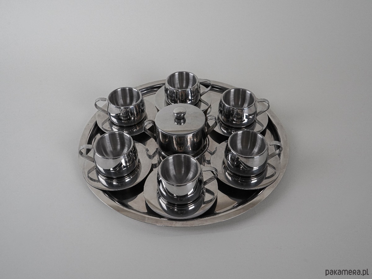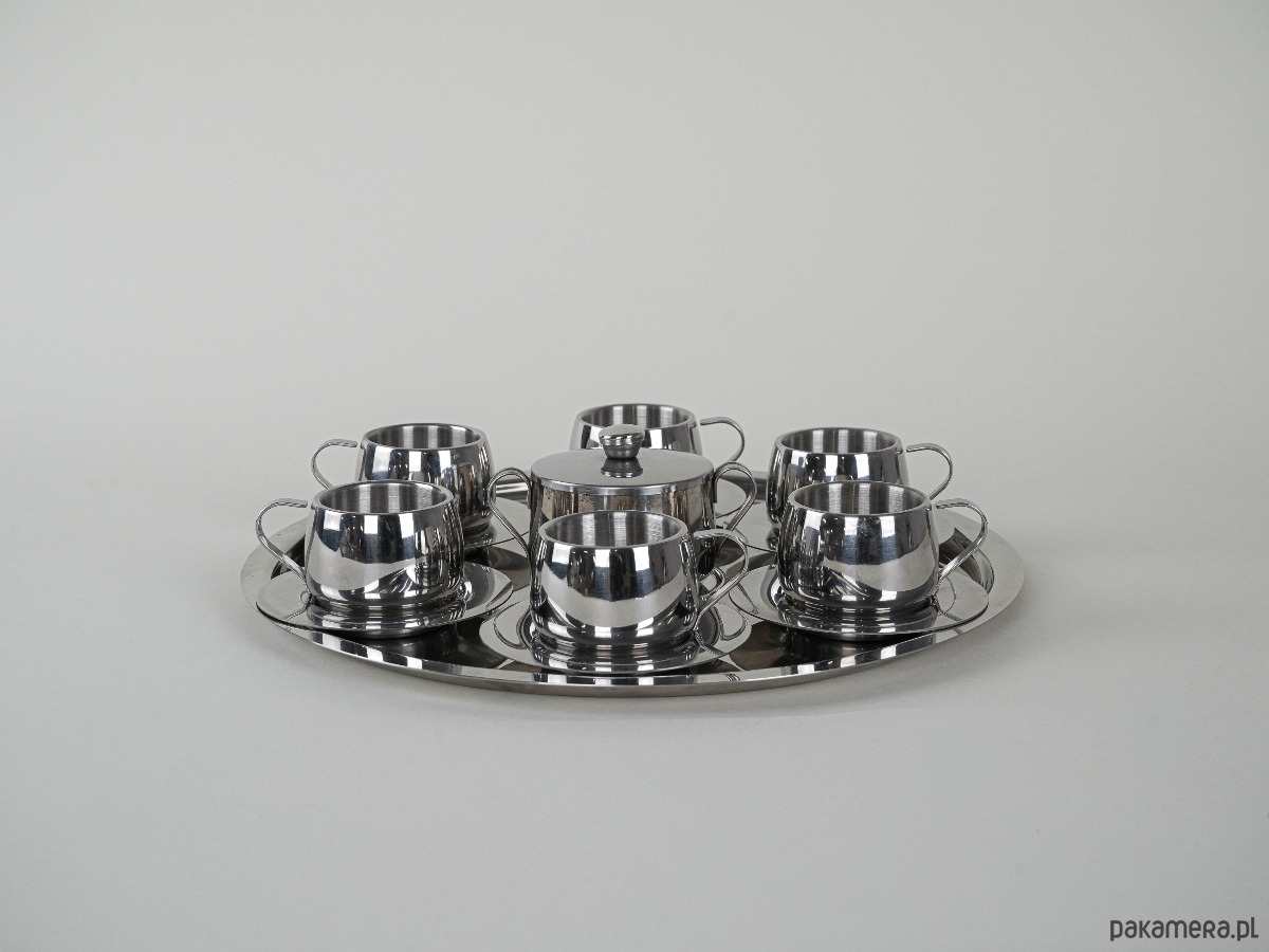 Komplet filiżanek z tacą i cukiernicą ze stali nierdzewnej – elegancki zestaw w stylu modernistycznym z lat 70.–80. XX w., wykonany z polerowanej stali nierdzewnej. Składa się z sześciu filiżanek ze spodkami, cukiernicy z pokrywką i dużej tacy. Ponadczasowy design i wysoka jakość wykonania sprawiają, że świetnie odnajdzie się w każdej aranżacji, a jego walory kolekcjonerskie czynią go wyjątkową ozdobą stołu.