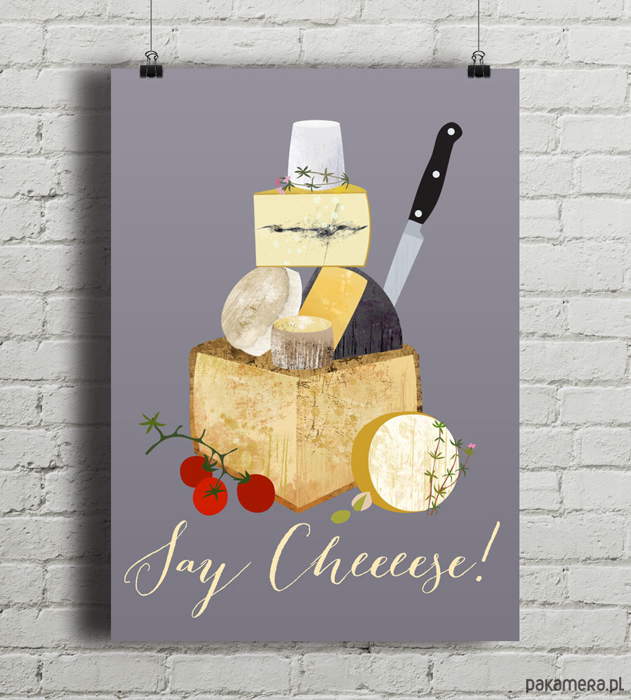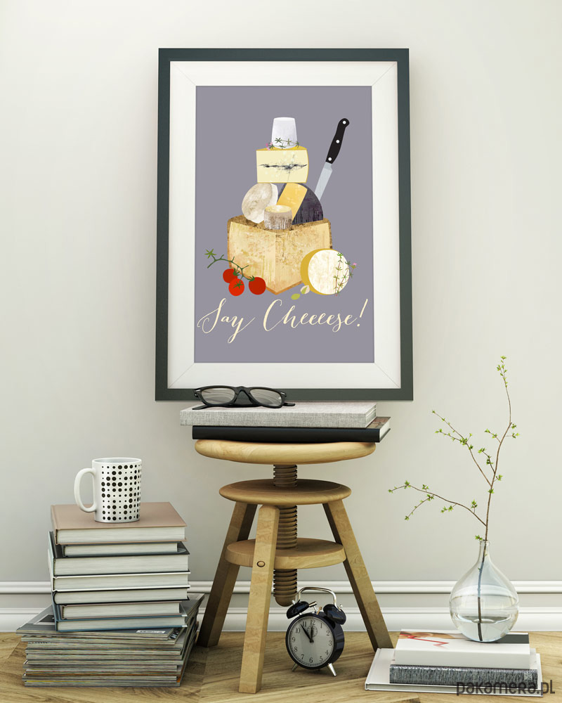 Plakat w stylu skandynawskim z autorską grafiką przedstawiającą przedstawiającą różne gatunki serów. Oryginalna dekoracja do wymarzonej kuchni. Zaprojektowany przez niemiecką artystkę Elisandrę Sevenstar.