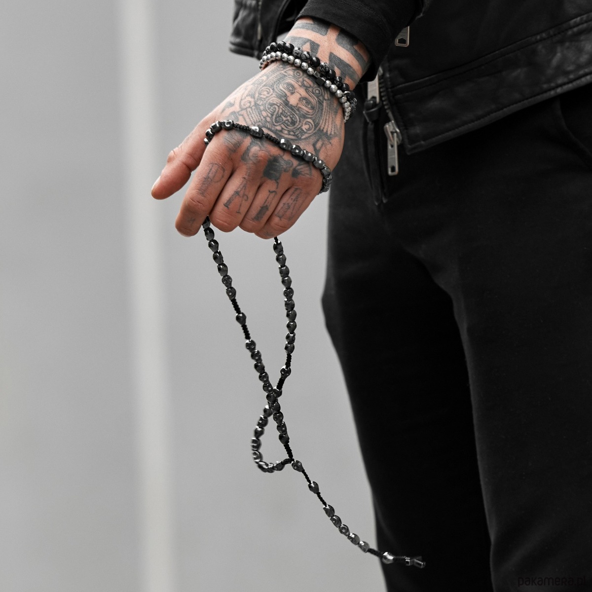 Noszone razem tworzą idealny duet – minimalistyczny, a zarazem pełen charakteru. To zestaw dla mężczyzny, który ceni sobie zarówno symbolikę, jak i modny design.Znaczenie kamieni:Hematyt to kamień wojowników. Silnie oczyszcza krew. Budzi radość do życia, dodaje odwagi i wiary we własne umiejętności.Obsydian śnieżny to kamień ochrony i motywacji. Wspiera zdobywanie nowych umiejętności i realizację celów. Nie pozwala czuć się demotywowanym przez innych.