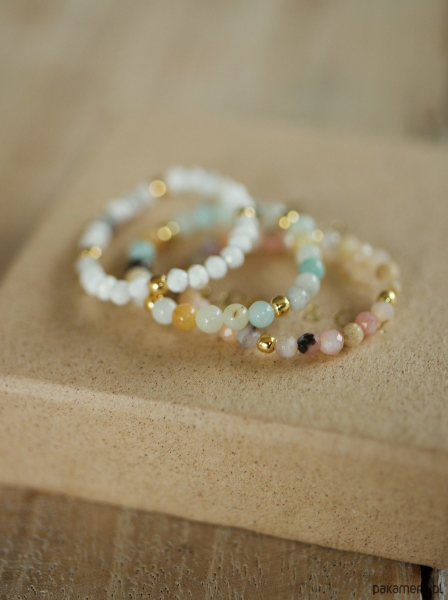 Zestaw pierścionków elastycznych z kamieni opalu, magnezytu i amazonitu. Między kamieniami znajdują się kuleczki ze srebra najwyższej próby z możliwością wyboru w wariancie złoconym 24 karatowym złotem.