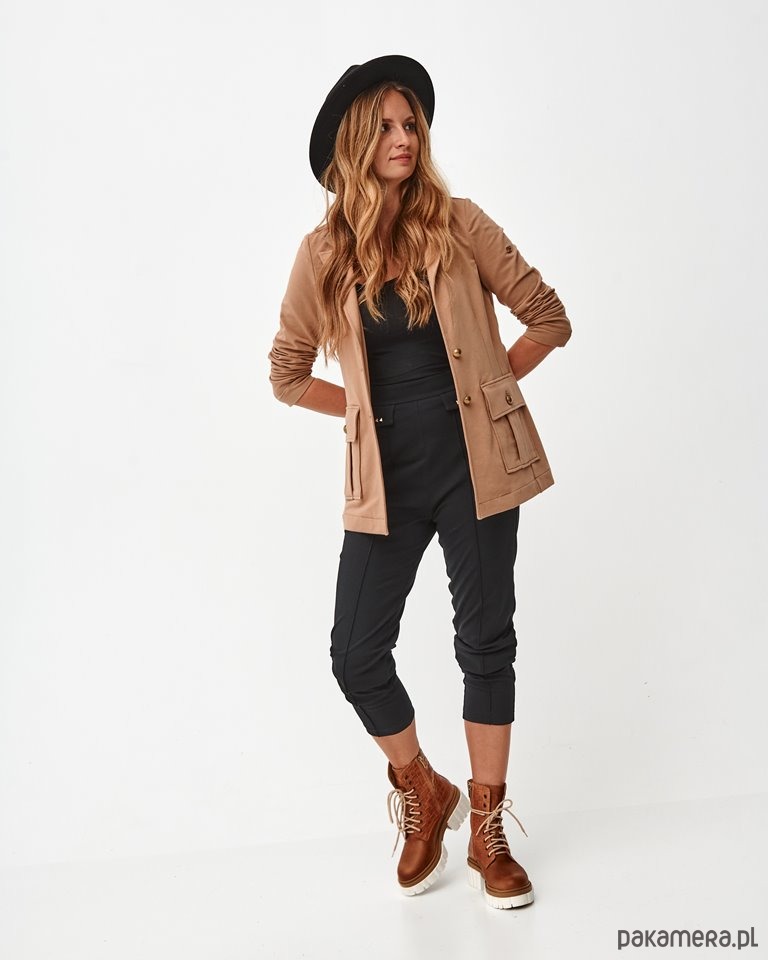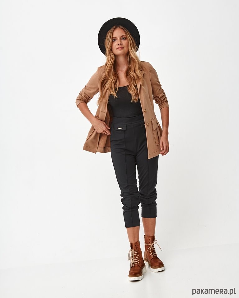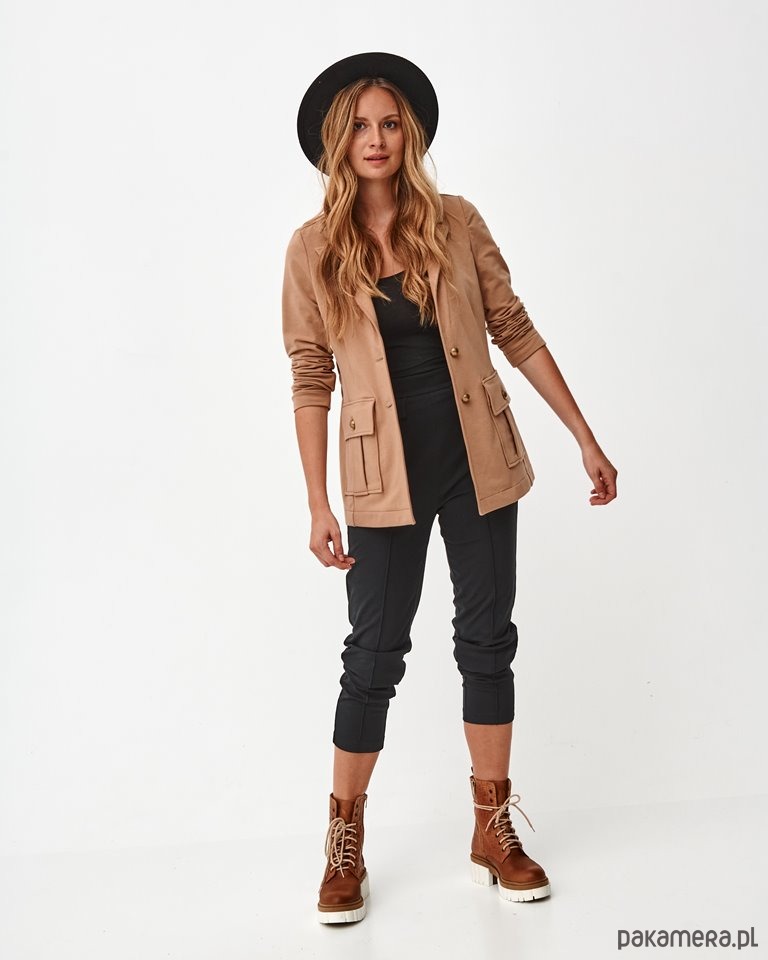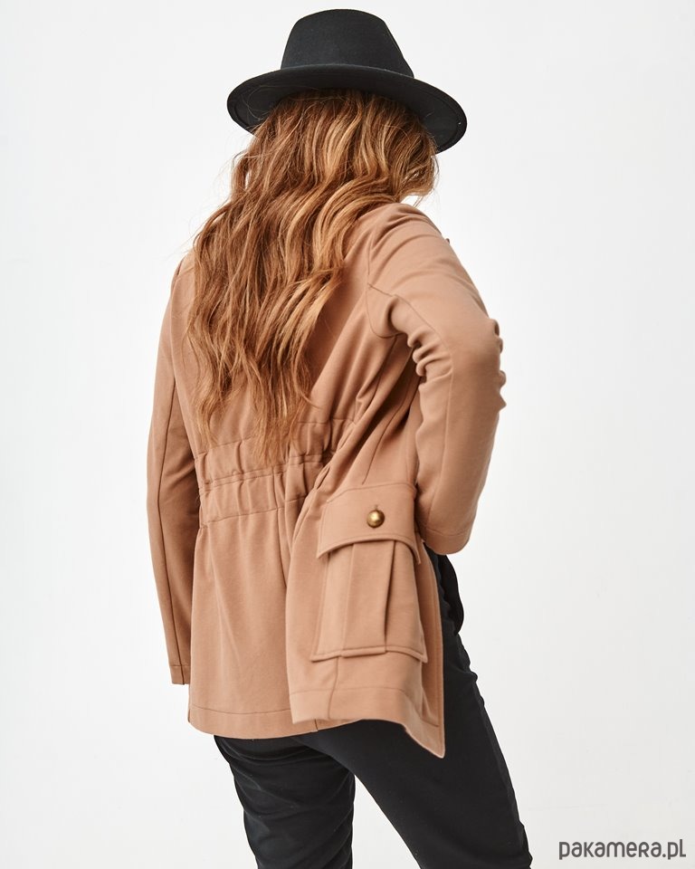 Idealnie skrojona dzianinowa marynarka z dwoma naszywanymi kieszeniami. Duże ozdobne guziki w kolorze starego złota z pewnością dodają jej charakteru. Z tyłu na wysokości talii szerokie marszczenie. Dzięki miękkiej dzianinie, z której jest wykonana jest niezwykle wygodna i nie krępuje ruchów. Marynarka doskonale sprawdzi się zarówno w codziennych stylizacjach, jak również na specjalne okazje.