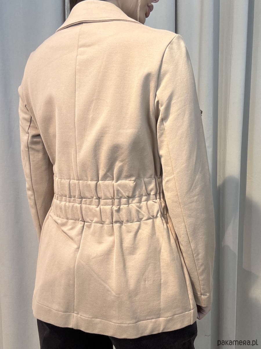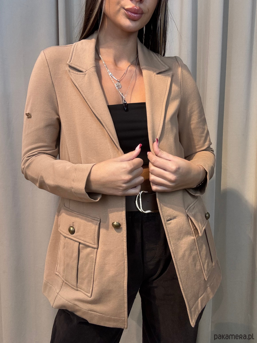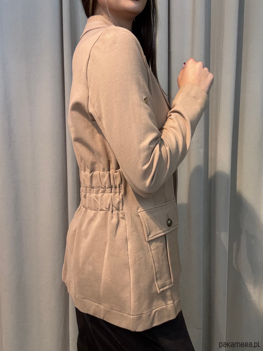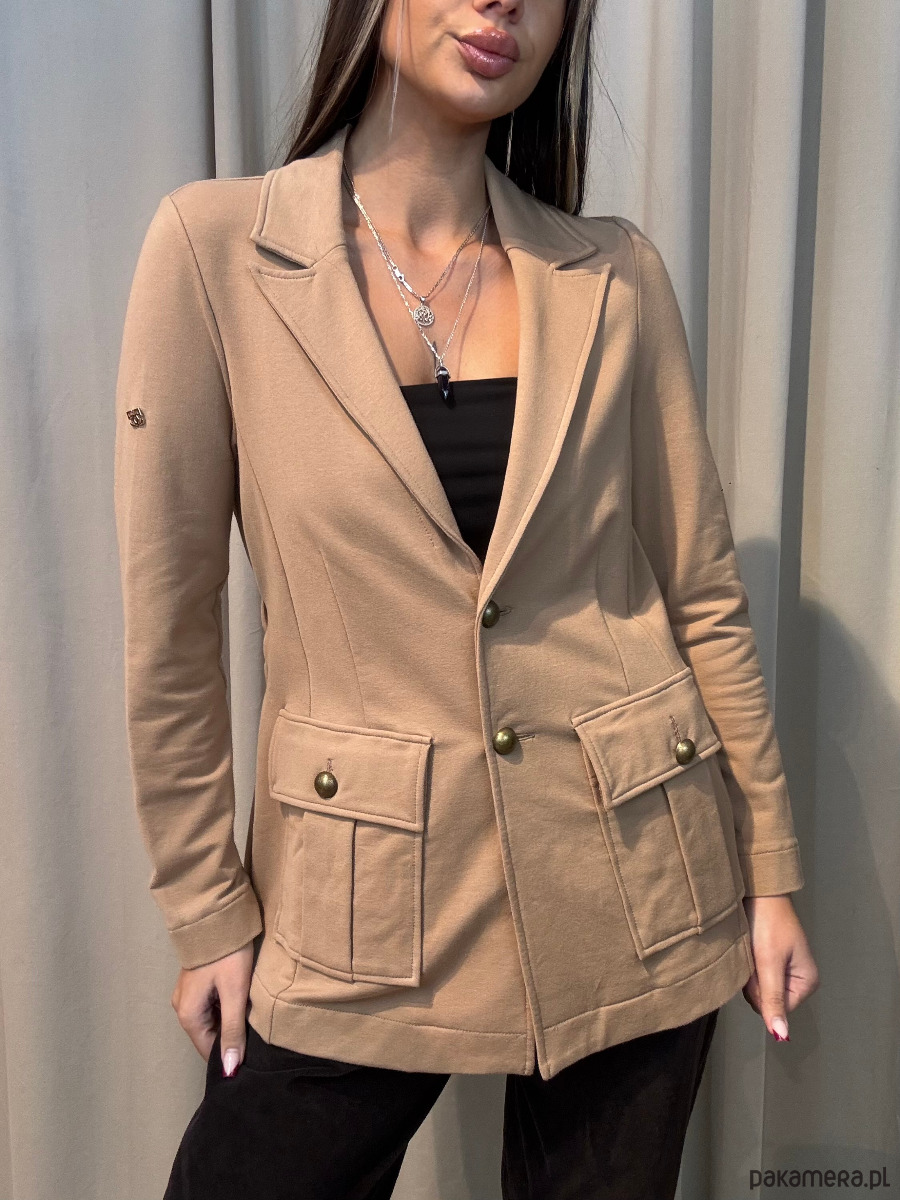 Idealnie skrojona dzianinowa marynarka z dwoma naszywanymi kieszeniami. Duże ozdobne guziki w kolorze starego złota z pewnością dodają jej charakteru. Z tyłu na wysokości talii szerokie marszczenie. Dzięki miękkiej dzianinie, z której jest wykonana jest niezwykle wygodna i nie krępuje ruchów. Marynarka doskonale sprawdzi się zarówno w codziennych stylizacjach, jak również na specjalne okazje.