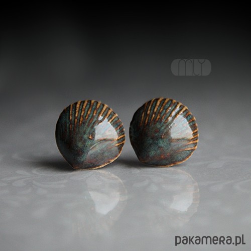 Ceramiczne, lekko nieregularne kolczyki w formie sztyftów, ręcznie wykonane z delikatnej gliny kamionkowej, jednostronnie szkliwione mieszanką brązowych i zielonych szkliw z efektem plamek i subtelnym połyskiem, na antyalergicznych sztyftach w kolorze srebrnym. Średnica ok. 12mm.Polecam