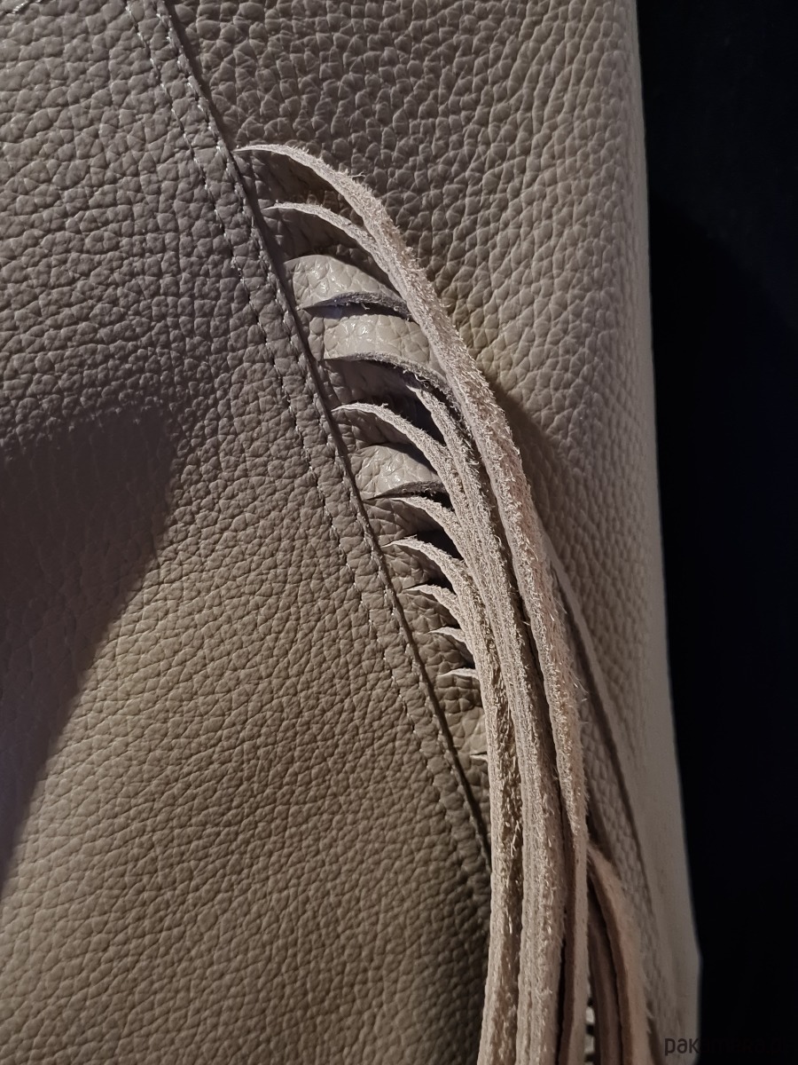 Wykonana z naturalnej włoskiej skóry licowej odpornej na zarysowania z delikatną fakturą groszku w modnym kolorze taupe. Oryginalna, mięsista z surowo wykończonym wnętrzem i frędzlami po obu bokach.