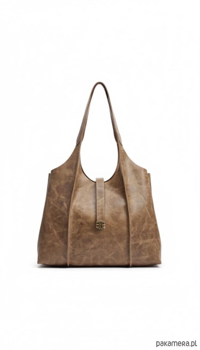 Torebka została wykonana z wysokiej jakości skóry naturalnej o charakterystycznej, przecieranej/postarzanej fakturze w ciepłym, brązowym odcieniu. To wykończenie sprawia, że jest odporna na codzienne użytkowanie, a jej wygląd z czasem zyskuje na unikalności. Przód zdobi dekoracyjny, pionowy pasek z metalowym, złotym okuciem o geometrycznym wzorze, które pełni funkcję zapięcia. Solidne szwy i przemyślana konstrukcja gwarantują trwałość na lata.