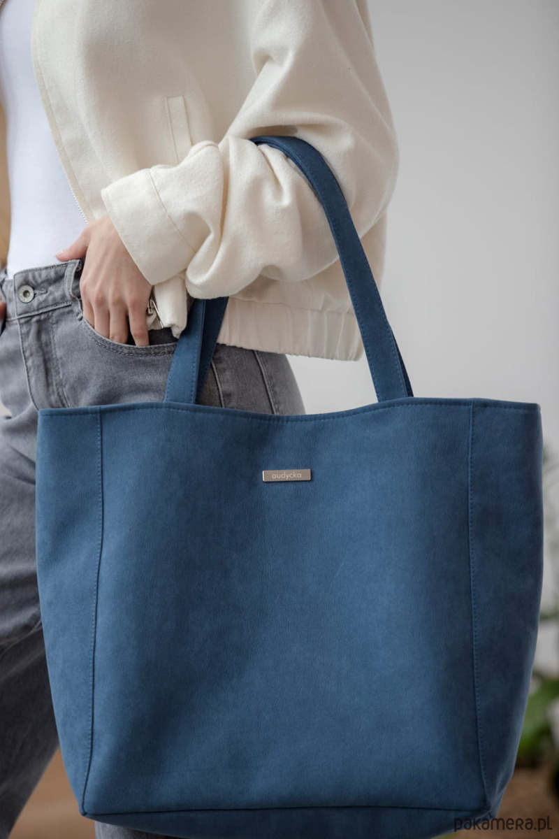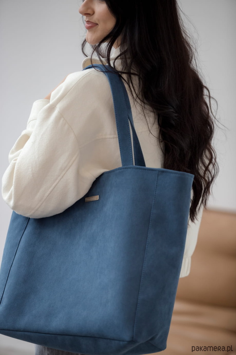 Shopper BASIC z nubuku tapicerskiego w kolorze ciemno niebieskim