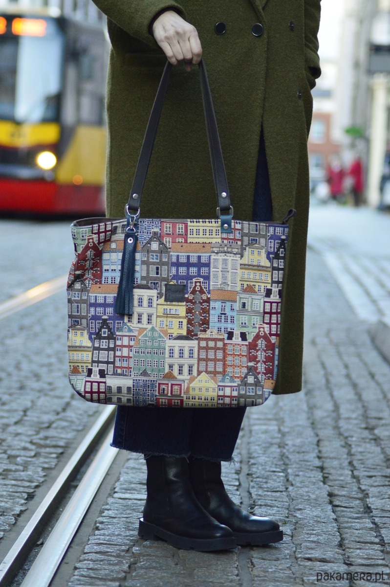 Torebka została wykonana z tkaniny tapicerskiej( czekoladowy tył) o fakturze nubuku ,gobelinu( domki )oraz skóry naturalnej ( rączki, łączenia, chwost).Całość zapina się na suwak, a wewnątrz znajdują się trzy kieszonki. Torba została wzmocniona warstwą wodoodporną. Wymiary torebki: ok. 40x46cm