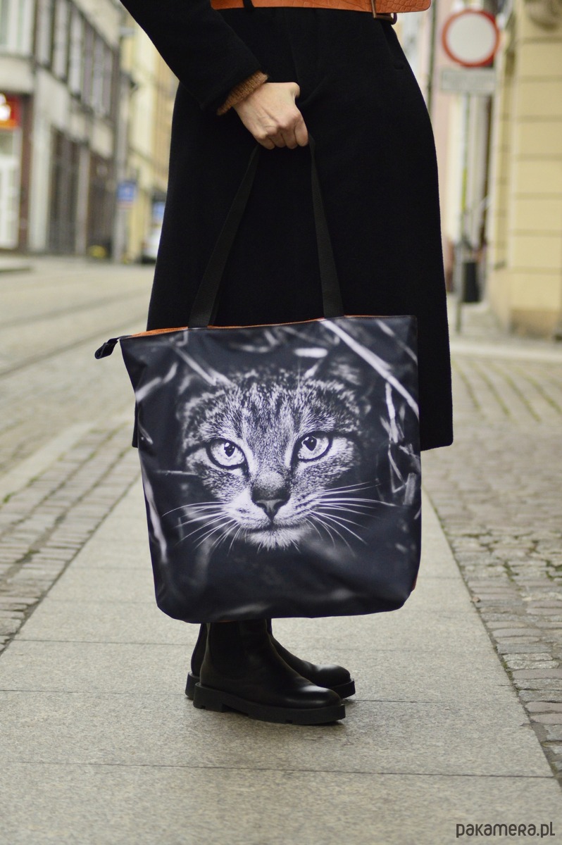Torba powstała z pięknego wydruku z wizerunkiem kota, tkaniny dekoracyjnej, bawełny oraz taśmy parcianej. Całość została wzmocniona warstwą wodoodporną, zapina się na suwak, a wewnątrz znajduje się kieszonka.