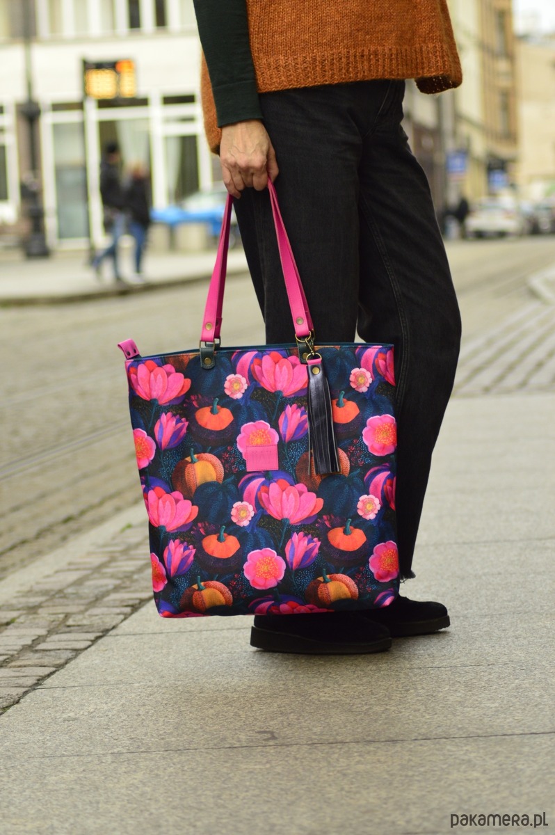 Torba powstała z mocnej tkaniny obiciowej o fakturze nubuku, wydruku na poliestrze oraz skóry naturalnej ( łączenia ,rączki oraz chwost). Całość jest dodatkowo wzmocniona materiałem wodoodpornym. Torba zapina się na suwak, a wewnątrz znajdują się trzy kieszonki ( w tym jedna na suwak). Dodatkowo torba ma z tyłu kieszonkę na suwak.