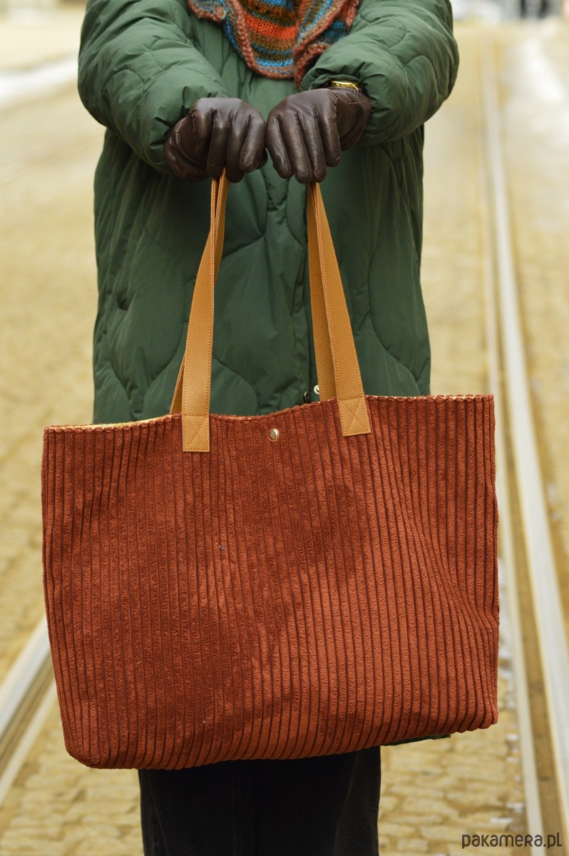 Torba do zadań specjalnych! Połączenie tapicerskiego sztruksu oraz skóry naturalnej ( Wygodne, szerokie rączki). Całość zapina się na napkę. Wewnątrz znajdują się trzy kieszonki.