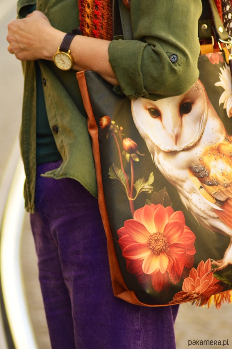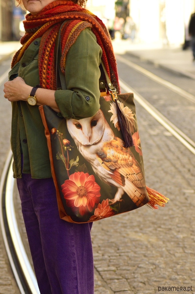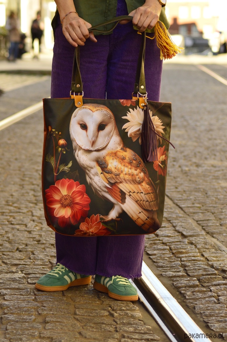 Torba powstała z mocnej tkaniny obiciowej o fakturze weluru, wydruku na poliestrze oraz skóry naturalnej ( łączenia ,rączki oraz chwost). Całość jest dodatkowo wzmocniona materiałem wodoodpornym. Torba zapina się na suwak, a wewnątrz znajdują się trzy kieszonki ( w tym jedna na suwak).