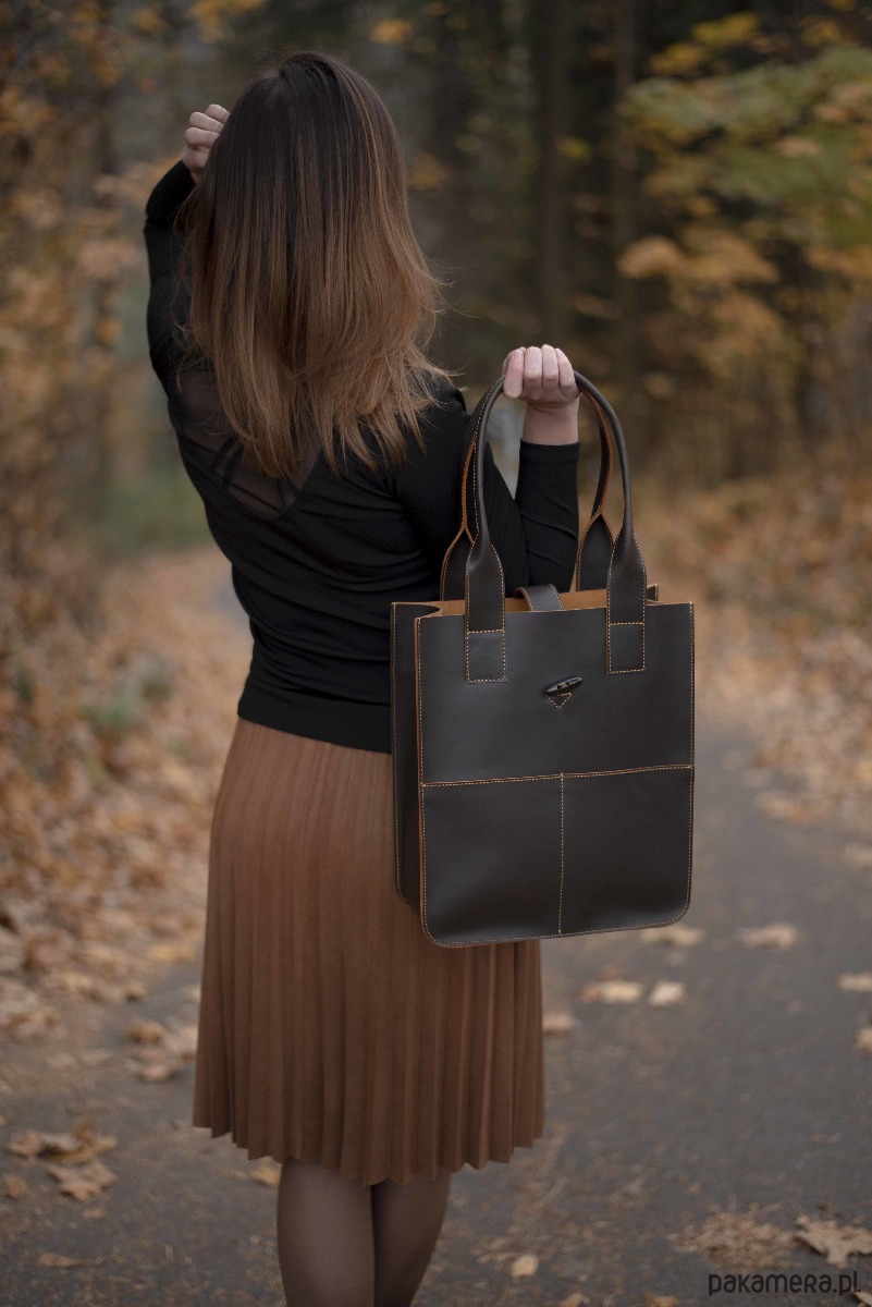 Solidna torba wykonana ze skóry naturalnej, garbowanej roślinnie, bez zastosowania szkodliwego chromu. Oferowany shopper wykonany w eleganckim kolorze czekoladowego brązu.