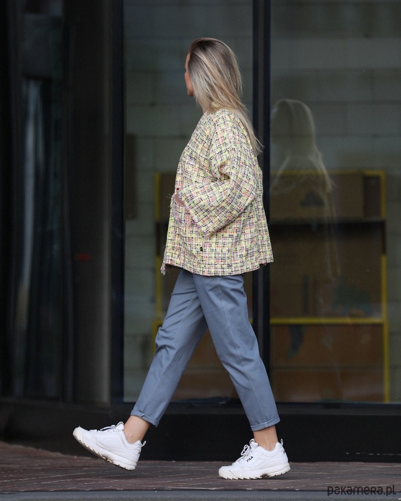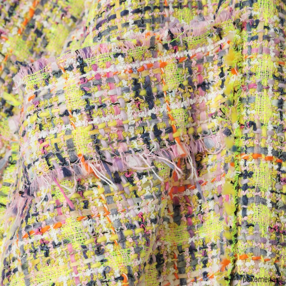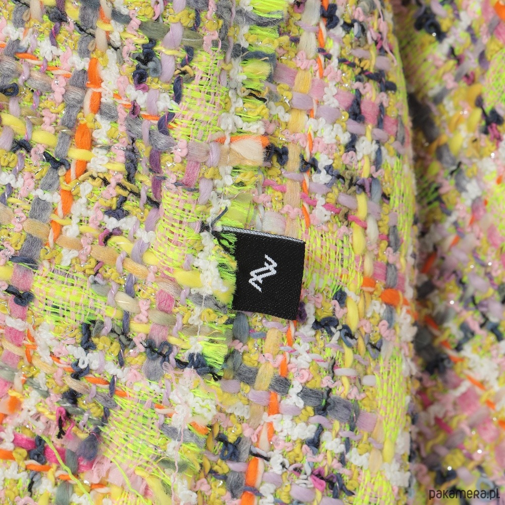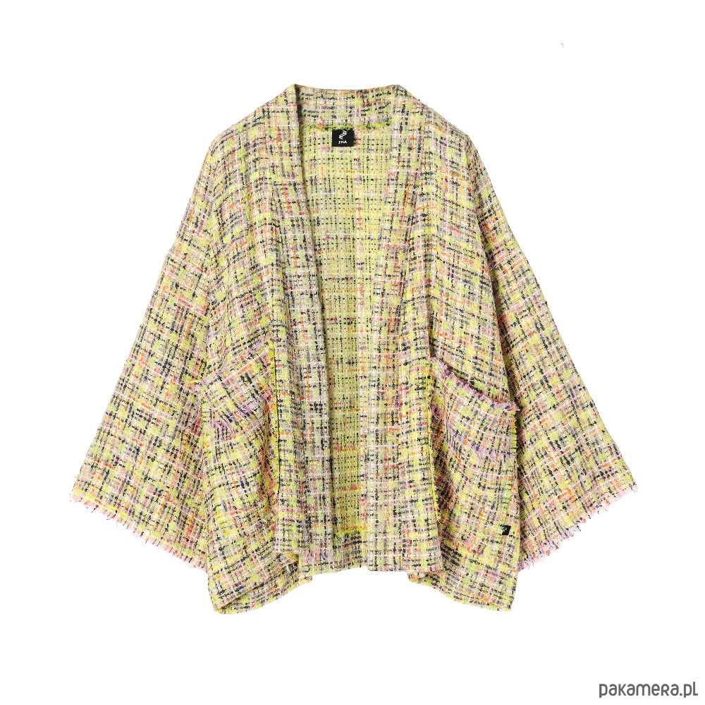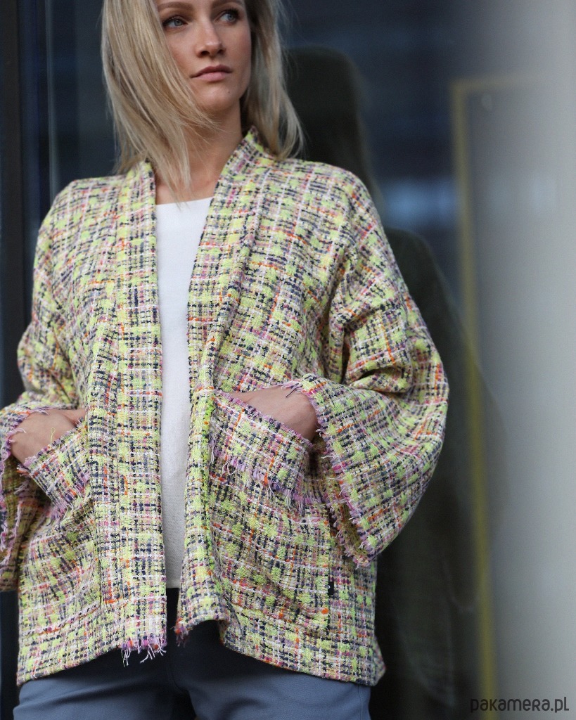 Kimono uszyte jest z kolorowej bawełnianej chanelki w neonowych, cytrynowych odcieniach z poprzeplatanymi nitkami we wszystkich kolorach tęczy.