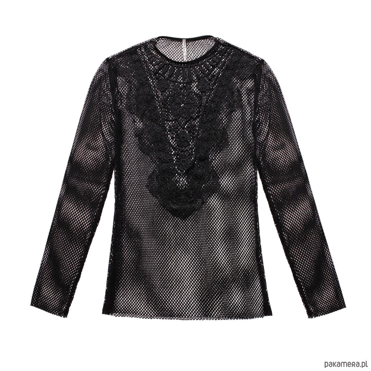 Ta wyjątkowa bluzka z transparentnej siateczki-kabaretki łączy w sobie zmysłowość i elegancję. Wykonana z półprzezroczystego materiału, który jest niezwykle miękki i przyjemny w dotyku, stanowi doskonałą bazę do stylizacji na wieczór i nie tylko. Na przodzie bluzki znajduje się duży, ozdobny haft, który przyciąga uwagę i nadaje całości unikalnego charakteru. Długie rękawy o surowym zakończeniu dodają jej modowego sznytu i sprawiają, że świetnie sprawdzi się zarówno w połączeniu ze spodniami, jak i spódnicą. Bluzka dostępna w kolorze głębokiej czerni, idealnie wpisuje się w styl nowoczesnej elegancji.