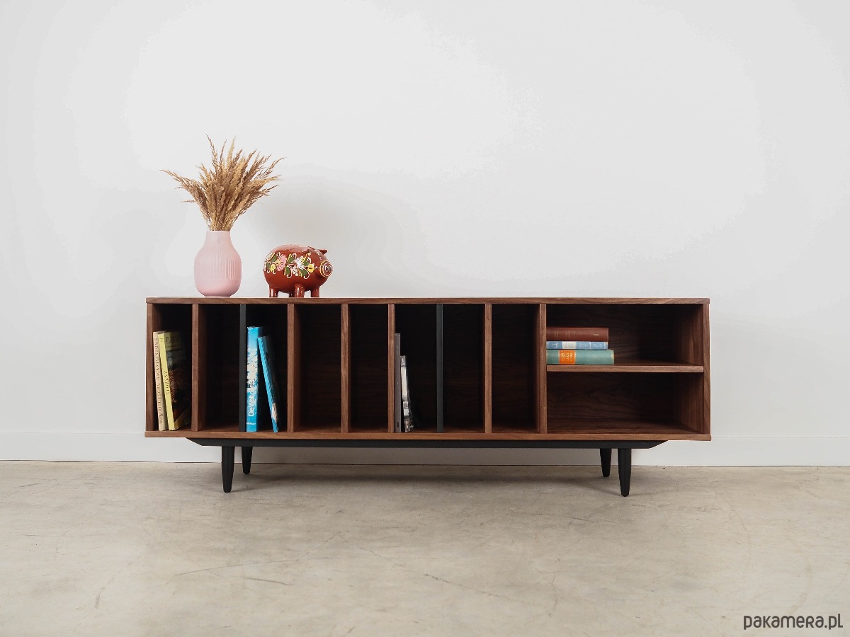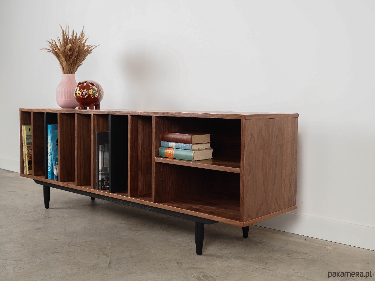 Konstrukcja pokryta jest fornirem orzechowym. Nogi wykonane z litego drewna wybarwionego na kolor czarny. Powierzchnia po odświeżeniu. Wewnątrz przestrzeń została wypełniona pojemną półką oraz praktycznymi przegródkami. Zarówno półka, jak i przegródki, posiadają możliwość regulacji.