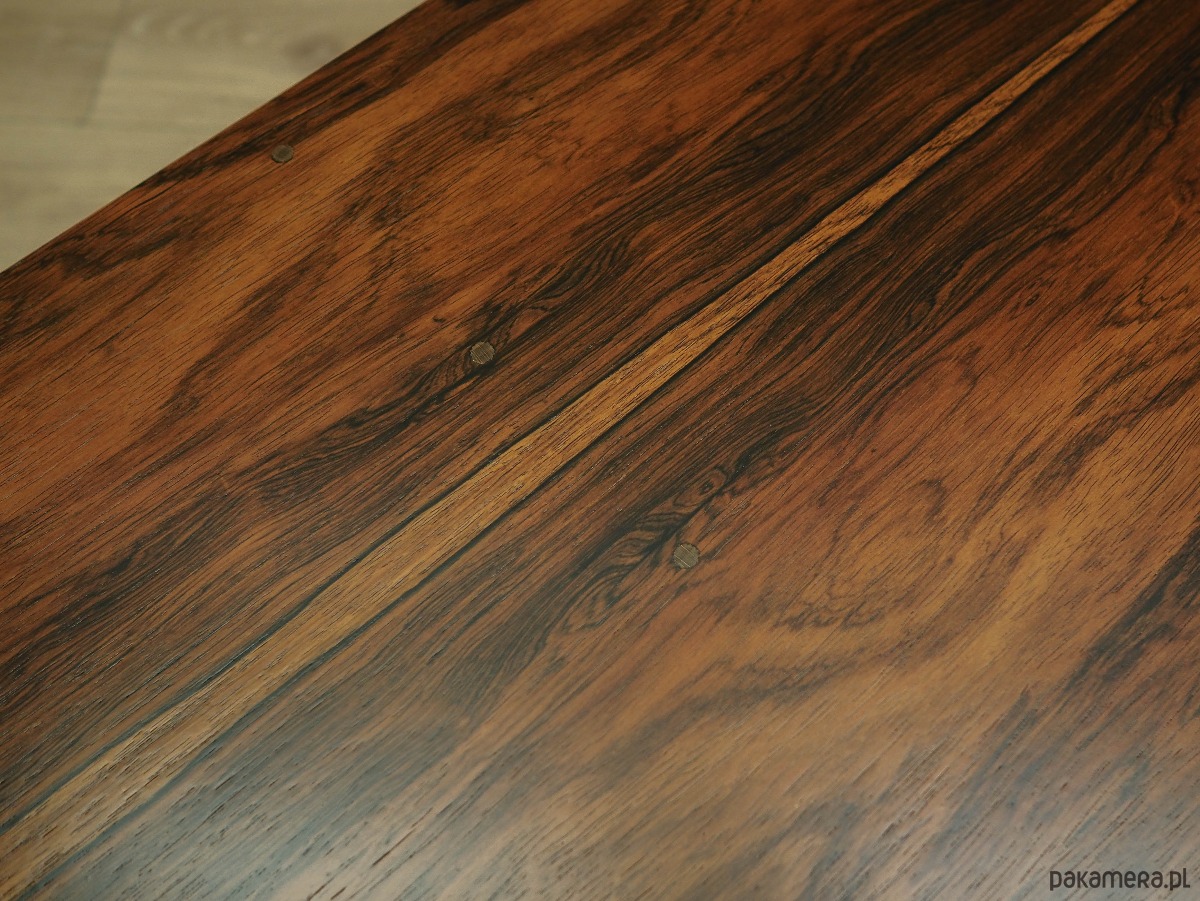 Konstrukcja pokryta jest fornirem palisandrowym. Nogi wykonane z litego drewna wybarwionego na kolor czarny. Powierzchnia po odświeżeniu. Wewnątrz przestrzeń została wypełniona trzema praktycznymi półkami z możliwością regulacji wysokości. Sideboard z klasycznym rozwiązaniem drzwi otwieranych, dzięki czemu mamy nieograniczony dostęp do całego wnętrza mebla.