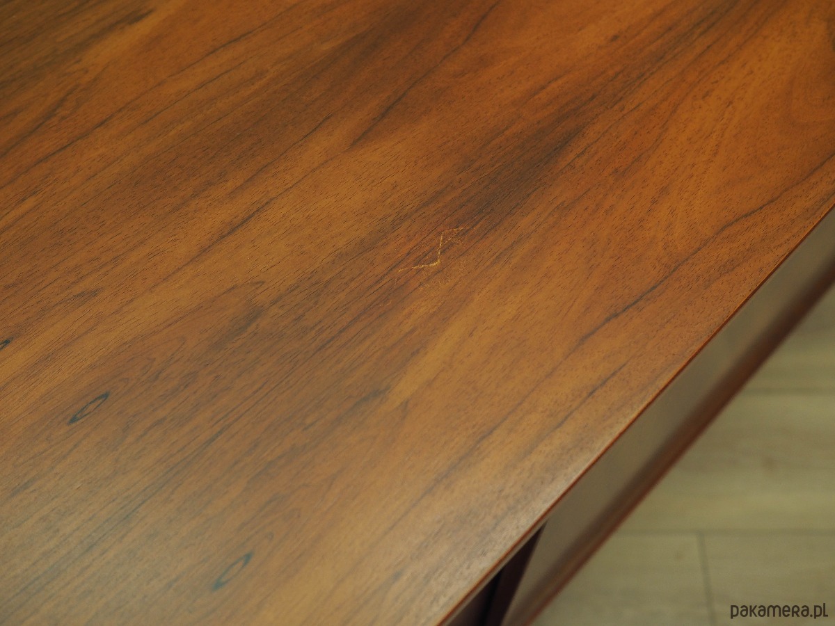 Stan: Powierzchnia po odświeżeniu. Widoczne drobne zarysowania oraz uzupełnione ubytki forniru. Większe ślady użytkowania zawsze przedstawiamy na zdjęciach. Produkt przygotowany bezpośrednio do użytkowania.