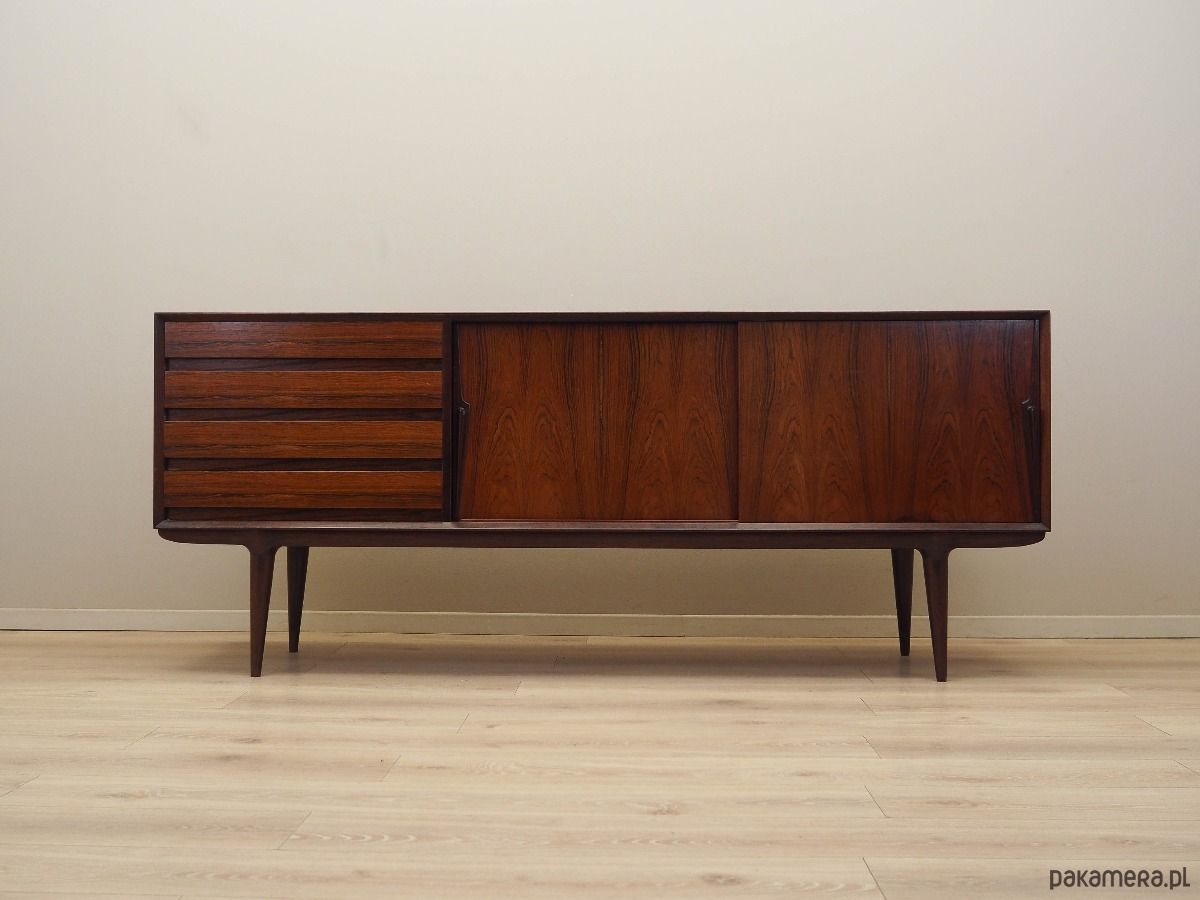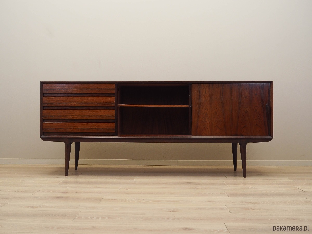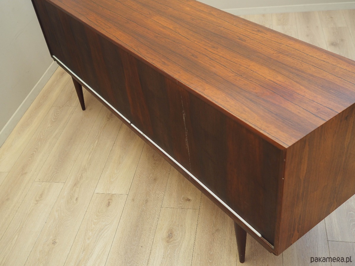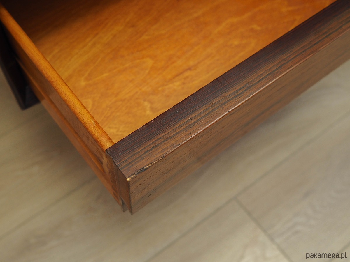 Konstrukcja pokryta jest fornirem palisandrowym. Nogi wykonane z litego drewna. Powierzchnia po odświeżeniu. Wewnątrz przestrzeń została wypełniona praktyczną półką z możliwością regulacji wysokości oraz czterema szufladami. Sideboard posiada wygodne rozwiązanie drzwi przesuwnych, dzięki czemu ograniczamy konieczność pozostawienia dużej wolnej przestrzeni przed meblem, jednocześnie nie ograniczając sobie dostępu do jego wnętrza. Ponadto drzwi przesuwne są idealnym rozwiązaniem, aby wykorzystać mebel pod sprzęt audio.