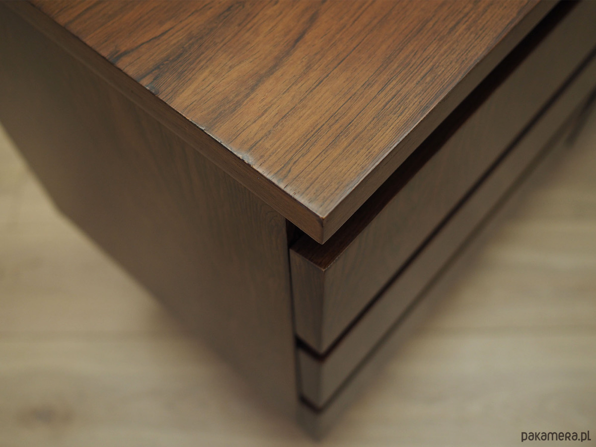 Konstrukcja pokryta jest fornirem palisandrowym. Nogi zostały wykonane z litego drewna wybarwionego na kolor czarny. Powierzchnia po odświeżeniu. Wewnątrz przestrzeń została wypełniona dwiema półkami bez możliwości regulacji wysokości oraz trzema pojemnymi szufladami. Mebel posiada wygodne rozwiązanie drzwi otwieranych, dzięki czemu mamy nieograniczony dostęp do jego wnętrza.