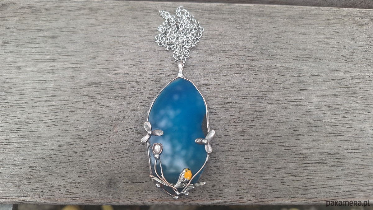 Wisiorek wykonany z miedzi, cyny, perły i agatu. Wymiary ok. 6 na 3 cm. Zawieszony na łańcuszku o długości ok. 50 cm.