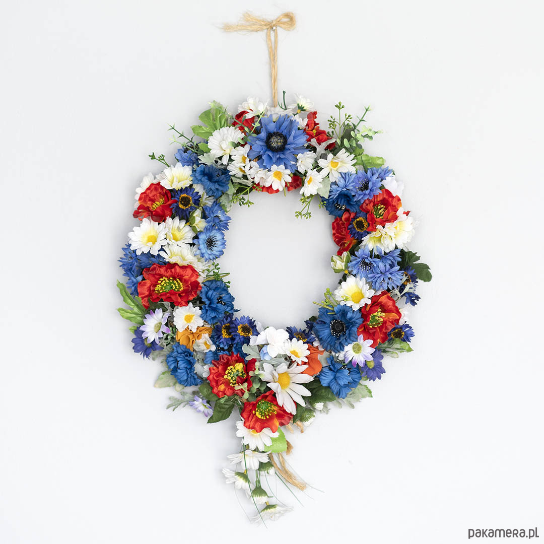 Sielski wianek będzie stanowił niezwykłą ozdobę Twoich wnętrz. Wianek udekorowany został kompozycją z polnych kwiatów: maków, chabrów i stokrotek, które będą kwitły w Twoim domu przez cały rok :) Średnica wianka to ok. 36 cm. Do zawieszenia np. na ścianie lub na drzwiach.