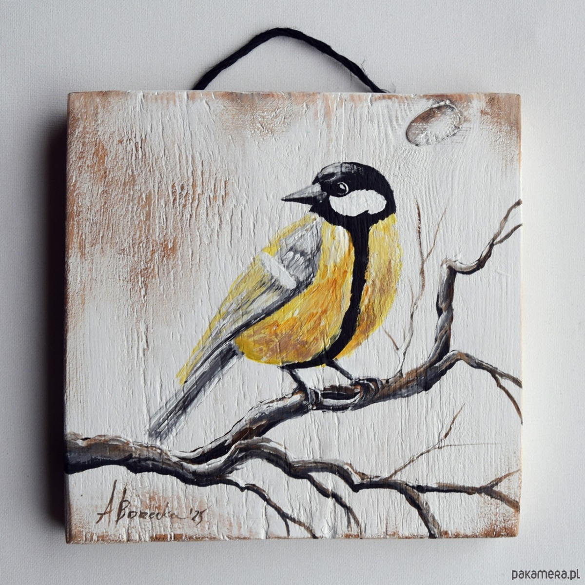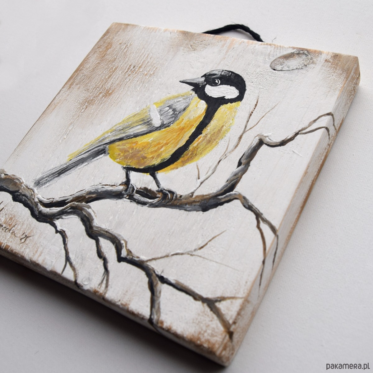 Obraz z serii Ptaki polskie, malowany farbami akrylowymi na grubej desce sosnowej. Całość jest pokryta werniksem dla ochrony przed wilgocią.