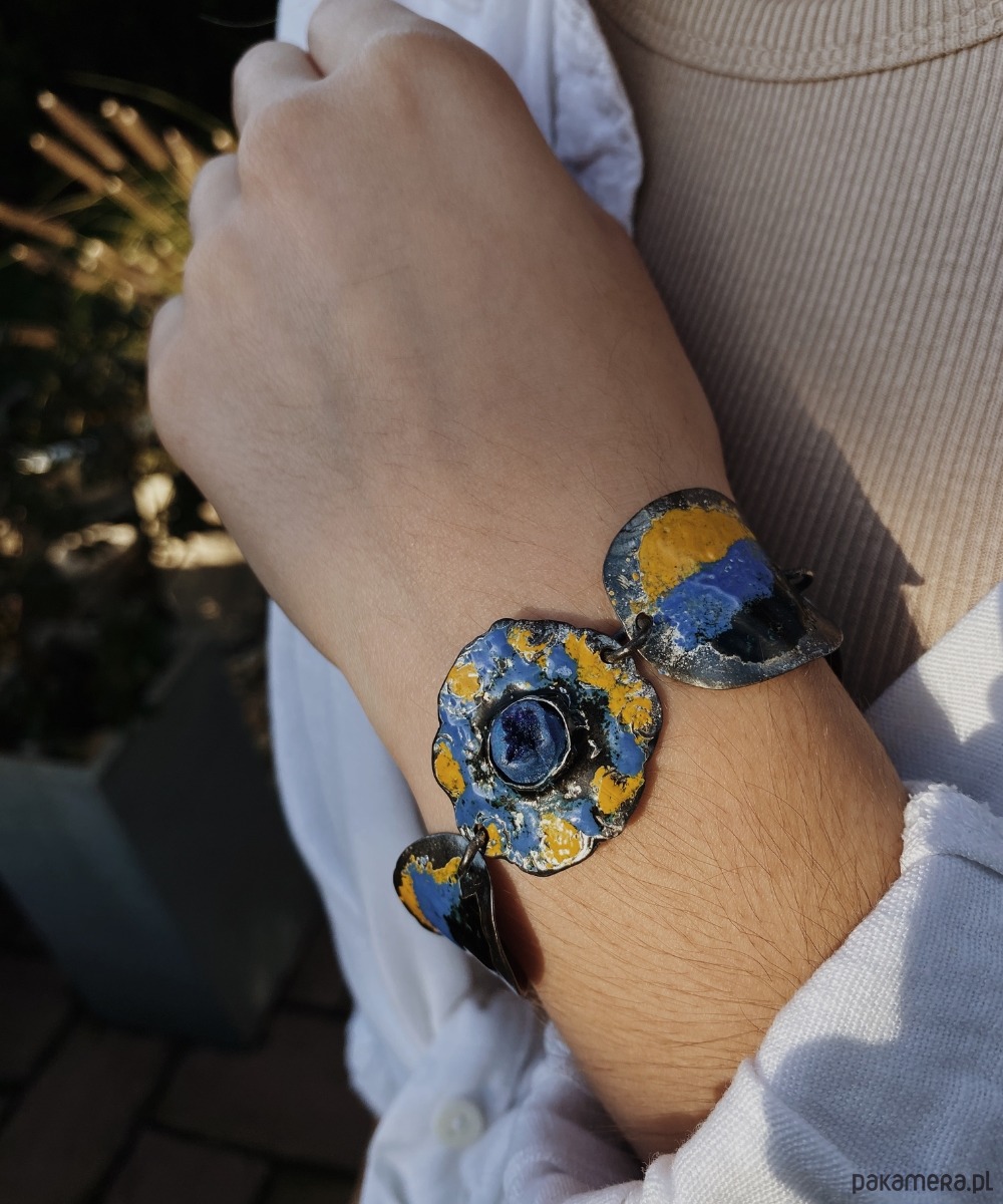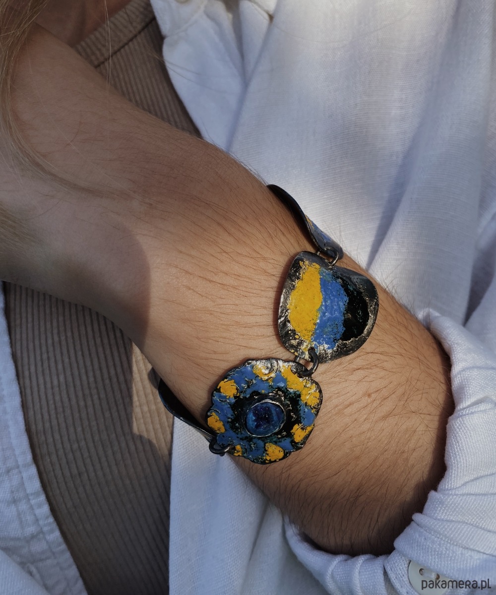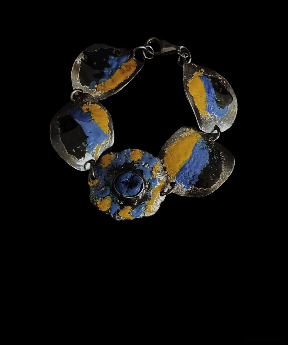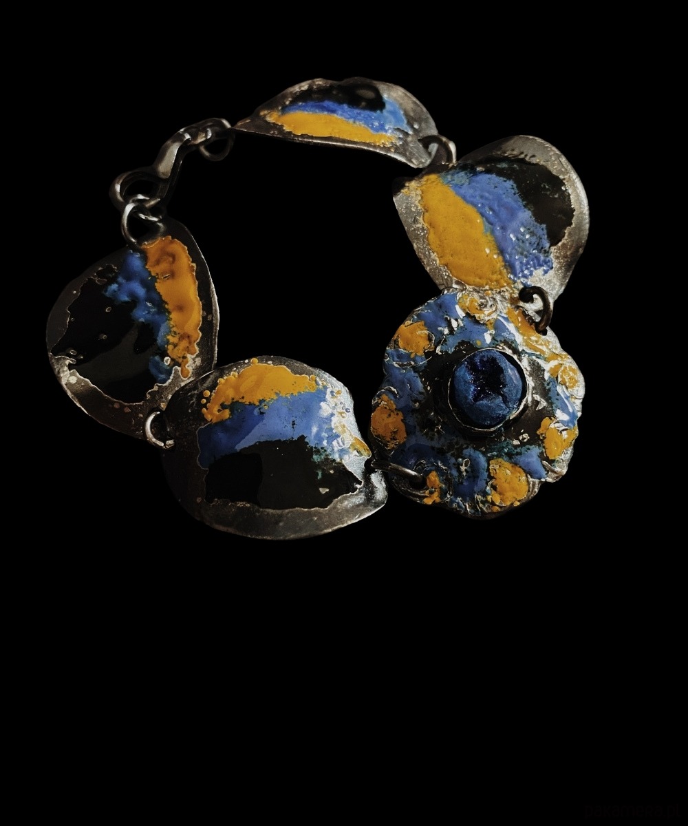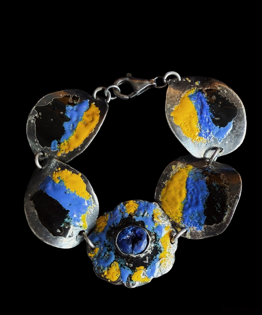 Ręcznie rzeźbiona srebrna bransoletka, której forma nawiązuje do swobodnych, organicznych kształtów natury. Jej powierzchnię zdobią nieregularne okręgi, pokryte emalią w barwach żółci, błękitu i czerni – kolorach przywołujących światło, głębię i tajemnicę. W samym centrum kompozycji umieszczony został azuryt – kamień nazywany przewodnikiem intuicji i duchowego rozwoju