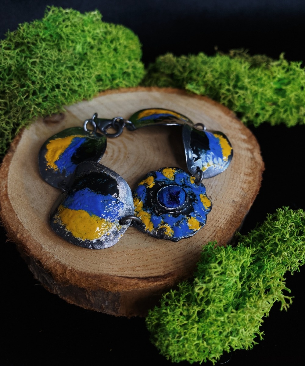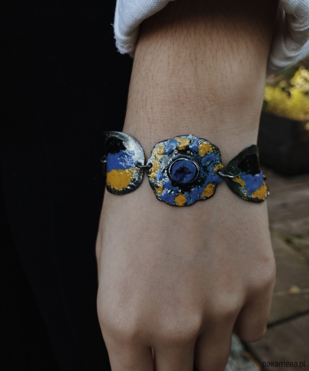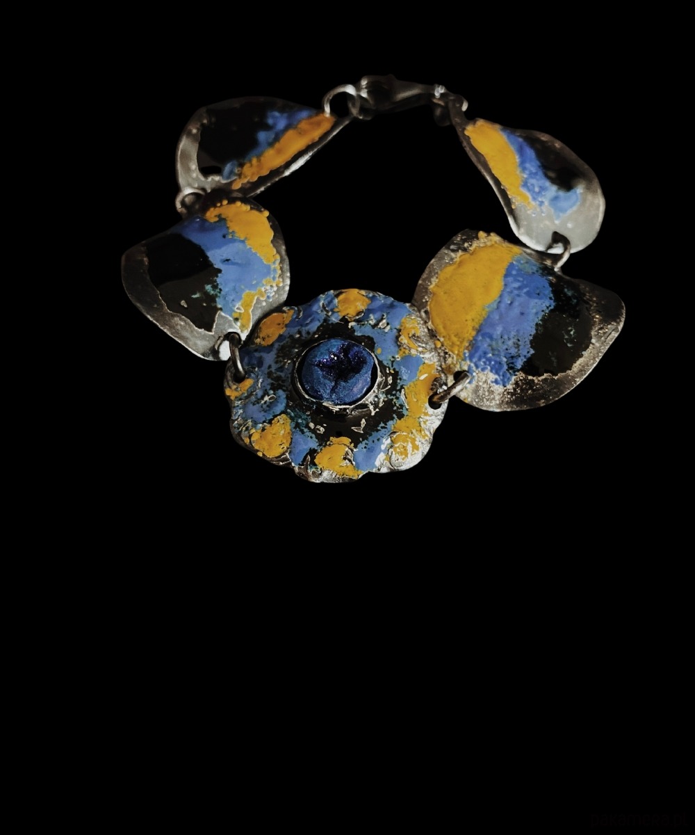 Bracelet made of the highest quality Art Clay Silver 999 with enamel and azurite.