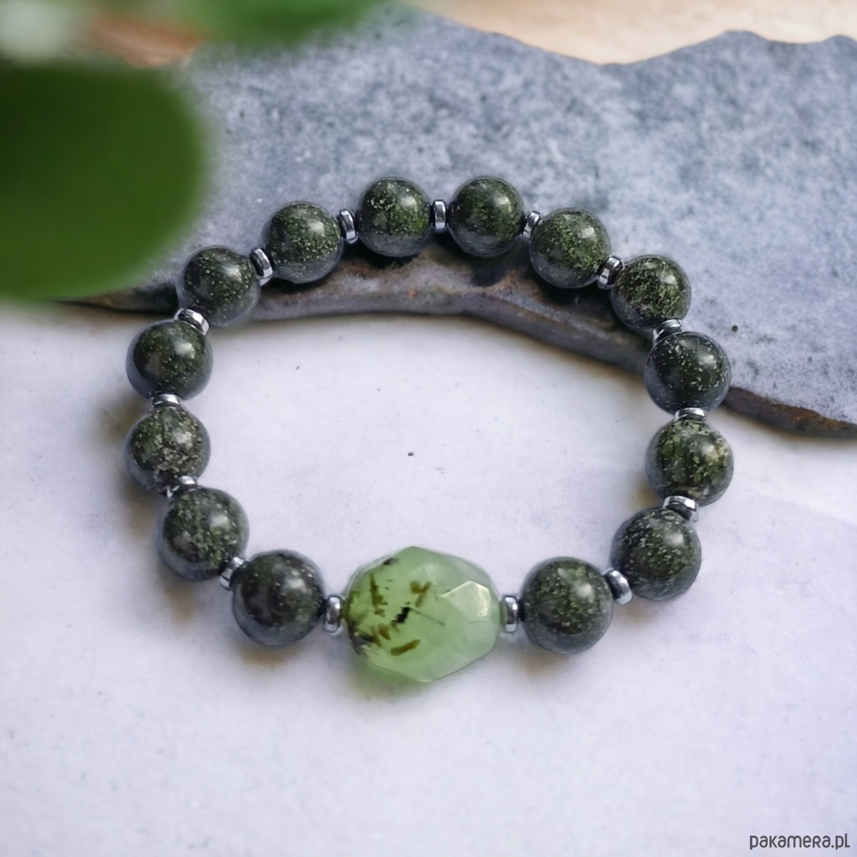 cudna, masywna i bardzo okazała bransoletka wykonana z fasetowanej bryłki prehnitu, kul jaspisu afrykańskiego 10mm i przekładek ze srebrnego hematytu.
