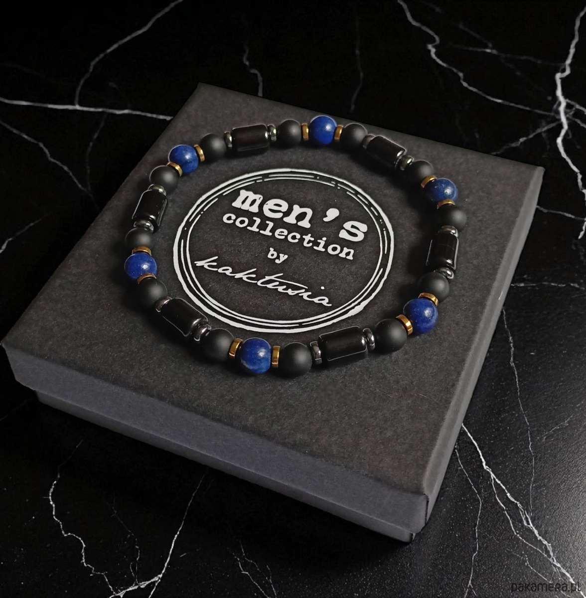 wykonana z kamieni o przekroju 6mm: onyks błysk (wałki), onyksu mat, lapis lazuli, przekładek z hematytu.