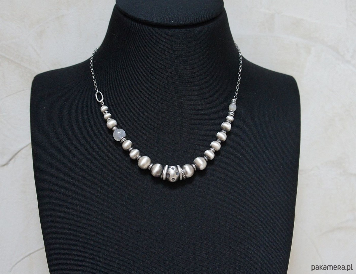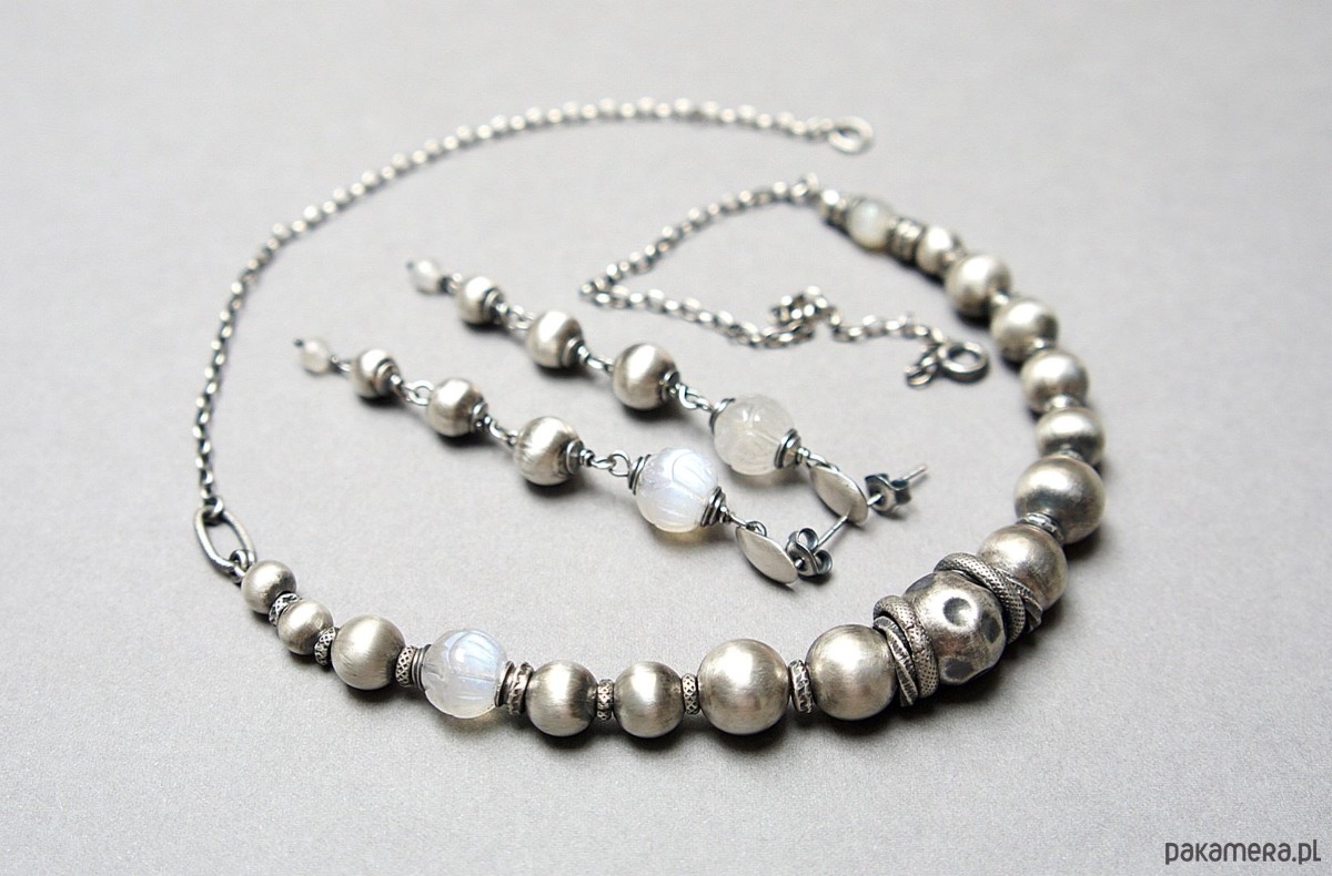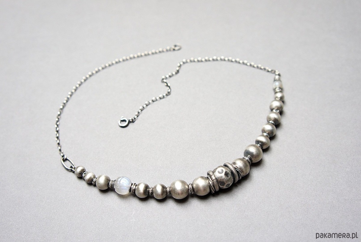 Naszyjnik wykonany ze srebra [pr. 925] w połączeniu ze srebrnymi kulami [12mm,10mm, 8mm i 6mm], rzeźbioną kuleczką kamienia księżycowego [10mm], fasetowaną kuleczką kamienia księżycowego mystic [6mm]. Srebro oksydowane i przetarte. Całkowita długość naszyjnika 46cm. Biżuteria ozdobnie zapakowana.