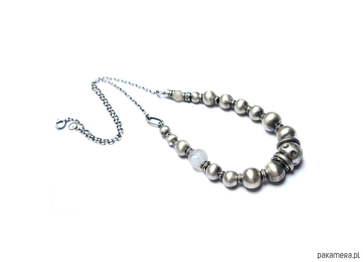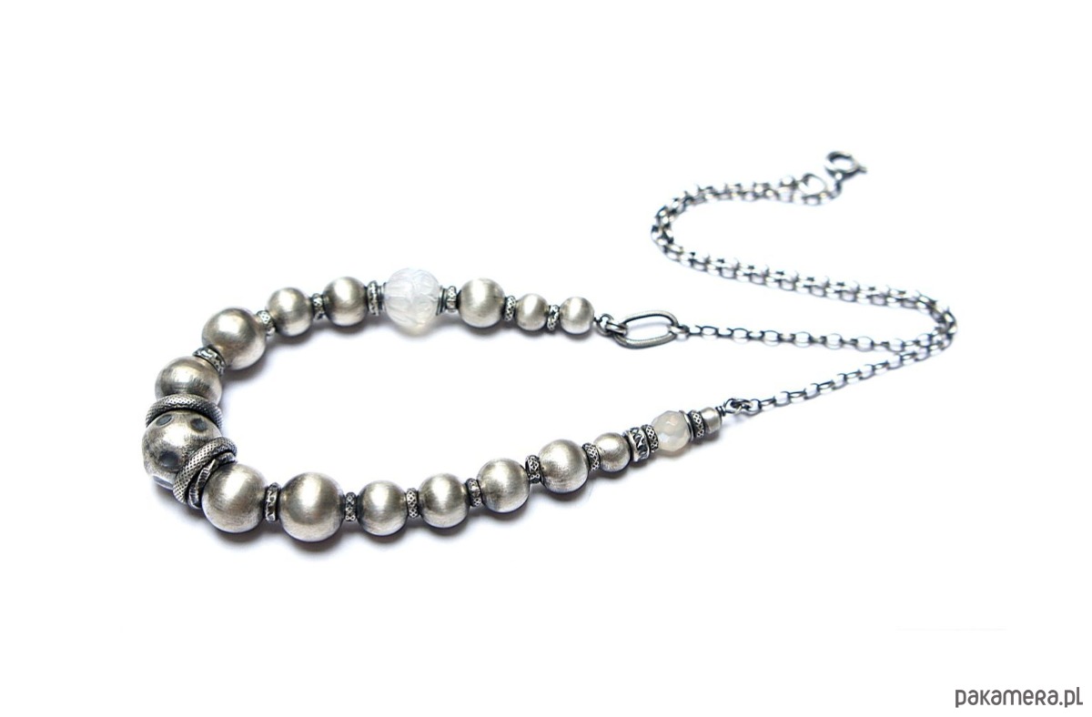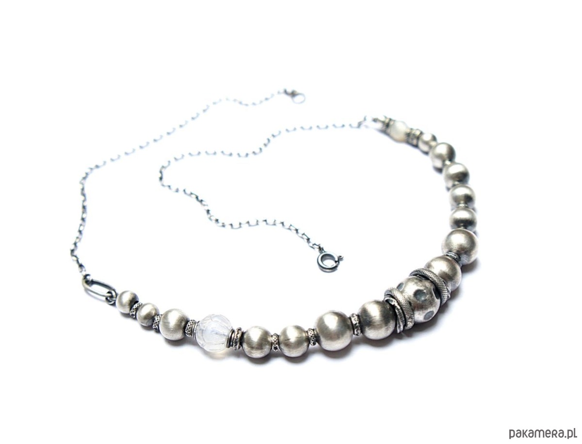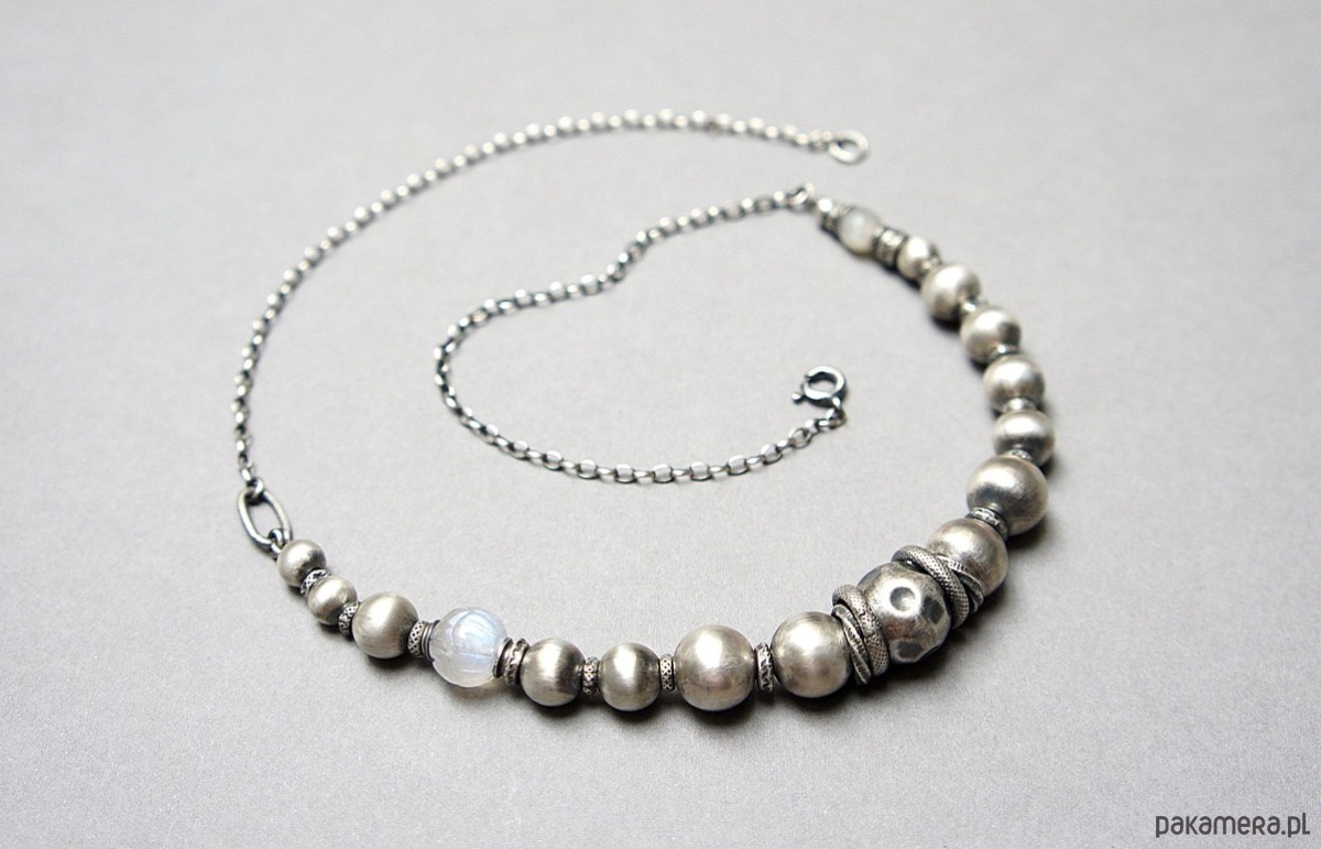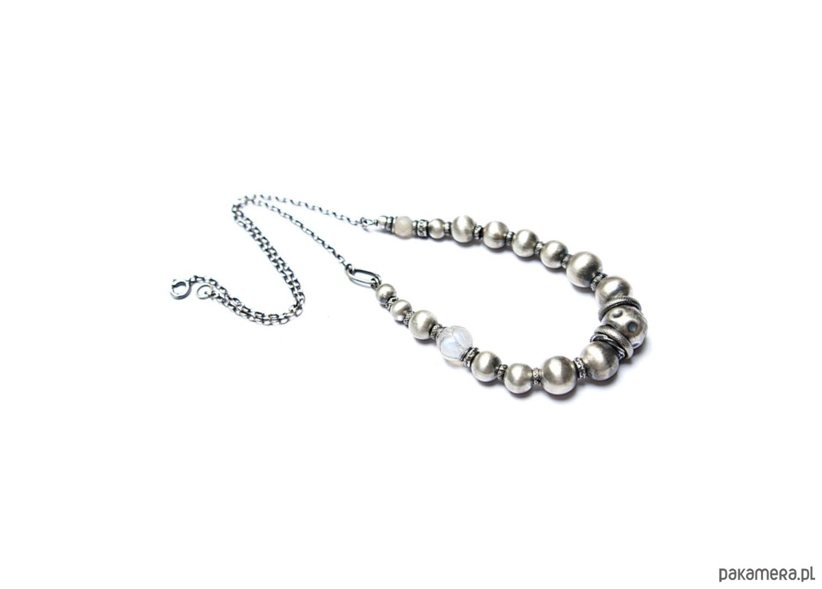 Naszyjnik wykonany ze srebra [pr. 925] w połączeniu ze srebrnymi kulami [12mm,10mm, 8mm i 6mm], rzeźbioną kuleczką kamienia księżycowego [10mm], fasetowaną kuleczką kamienia księżycowego mystic [6mm]. Srebro oksydowane i przetarte. Całkowita długość naszyjnika 46cm. Biżuteria ozdobnie zapakowana.