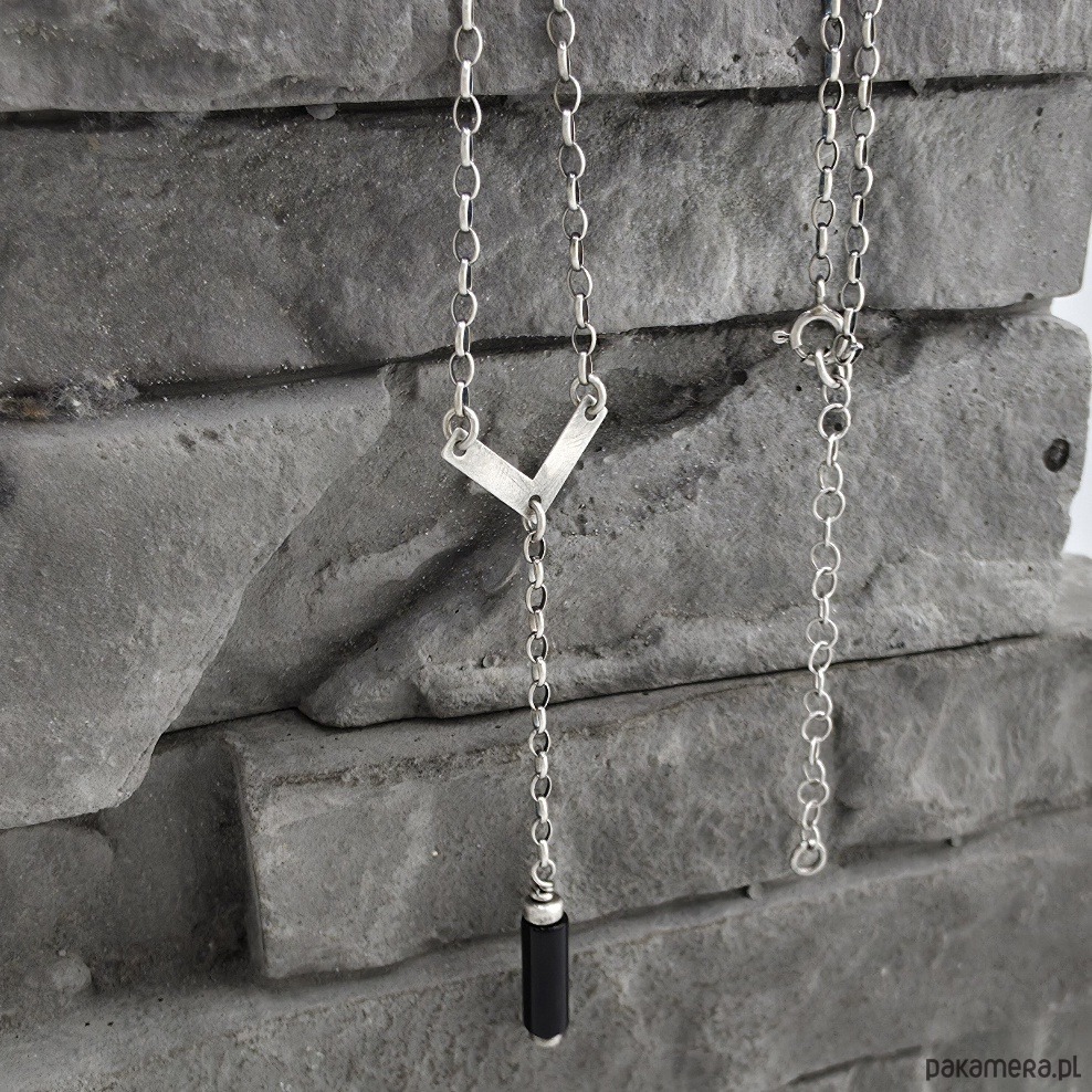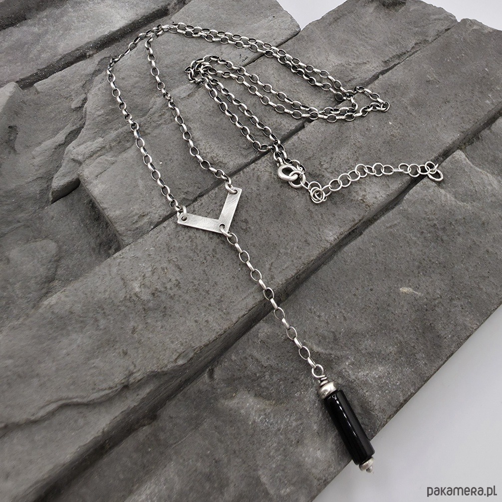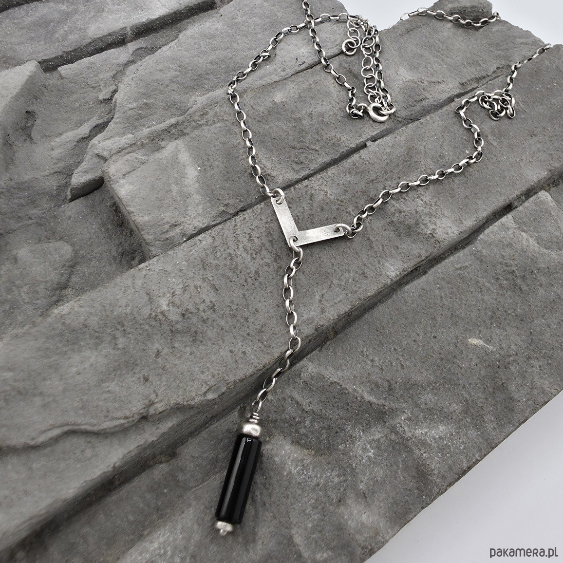 Subtelny, modny i kobiecy naszyjnik na co dzień i nie tylko. Wykonany w całości z oksydowanego srebra próby 925 oraz walca czarnego onyksu wielkosci 0,4 x 1,3 cm. Długość wisiorka to ok. 5,5 cm. Obwód naszyjnika to 55 cm plus regulacja 5 cm. Grubość łańcuszka to 2 mm. Mogę wykonać go w wersji nieoksydowanej. Ozdobnie zapakowany.
