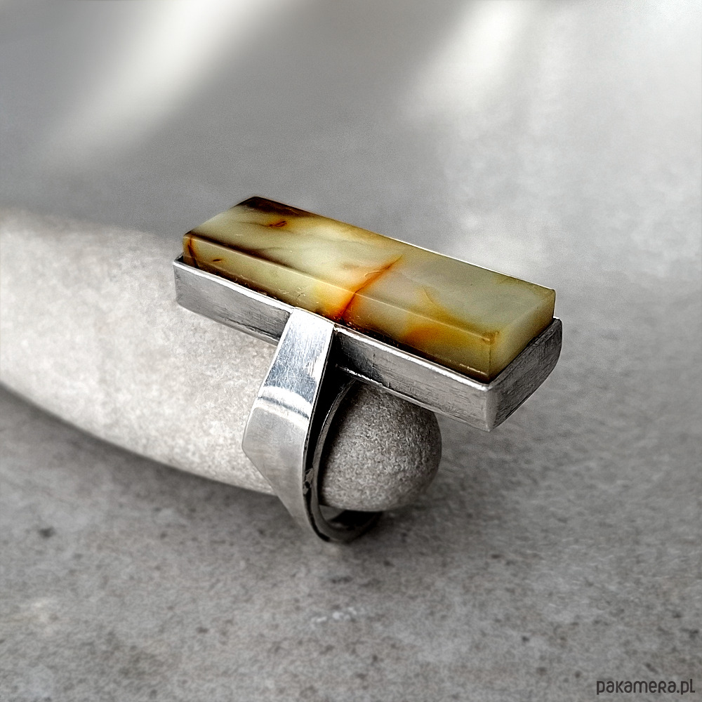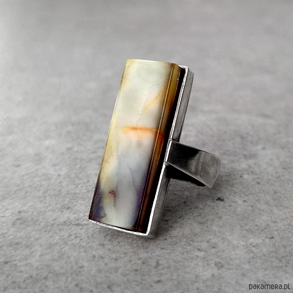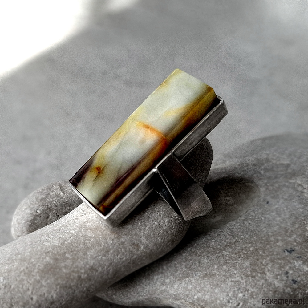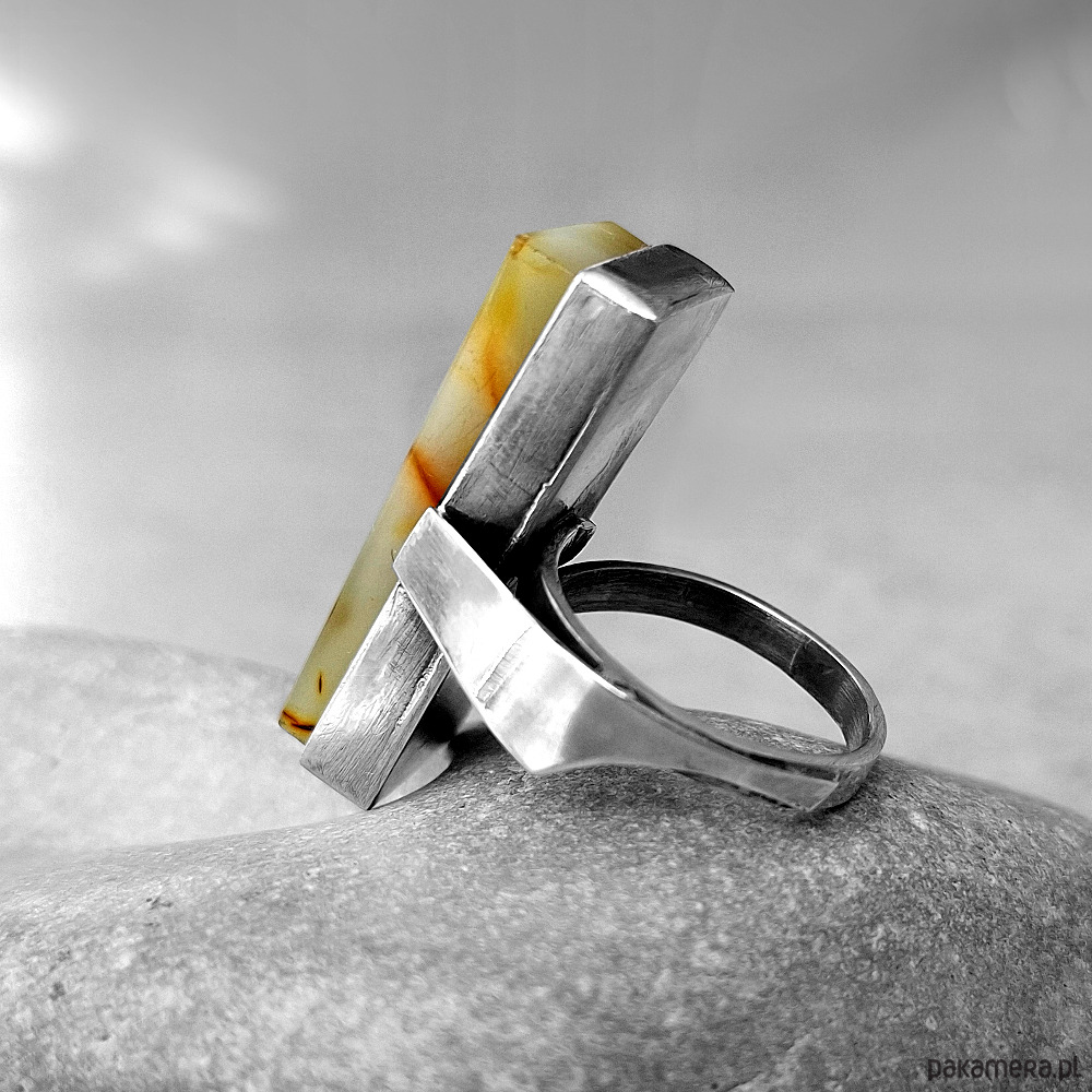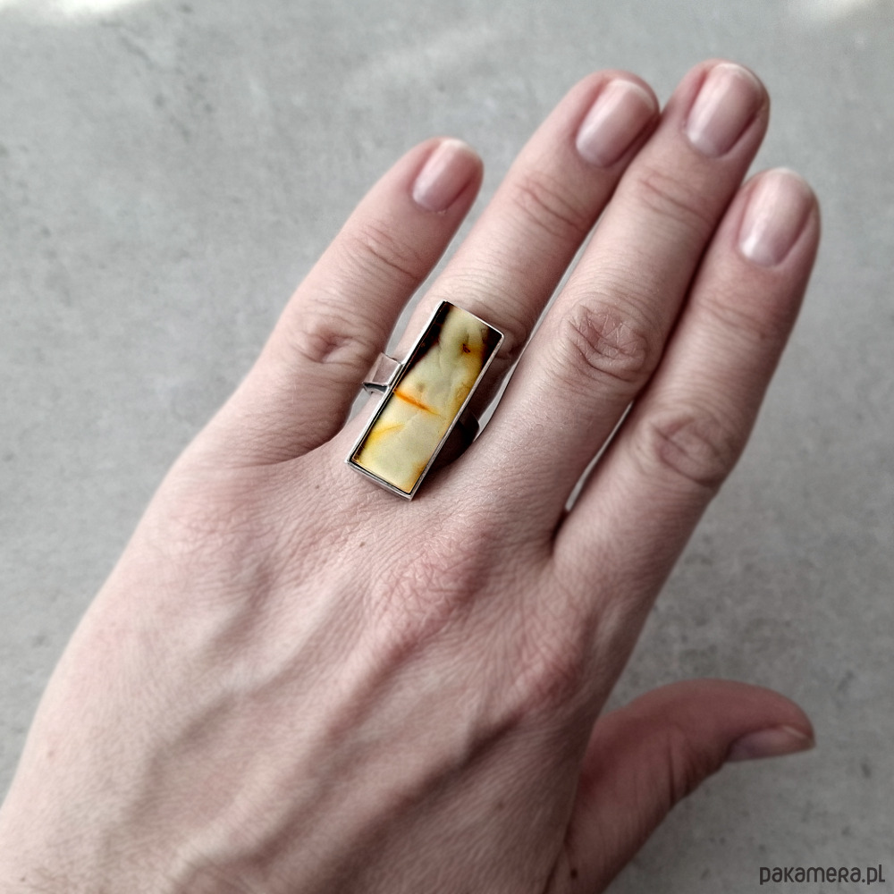 Prosty i okazały, przykuwający wzrok pierścień, wykonany w całości ręcznie ze srebra próby 930 i 999. Ozdobiony naturalnym bursztynem bałtyckim o unikalnej mlecznej barwie. Wymiary korony pierścionka: ok. 10x30 mm. Nieregularna ozdobna obrączka w rozmiarze regulowanym, z łatwością dostosuje się do każdej dłoni. Biżuteria zostanie ozdobnie zapakowana.
