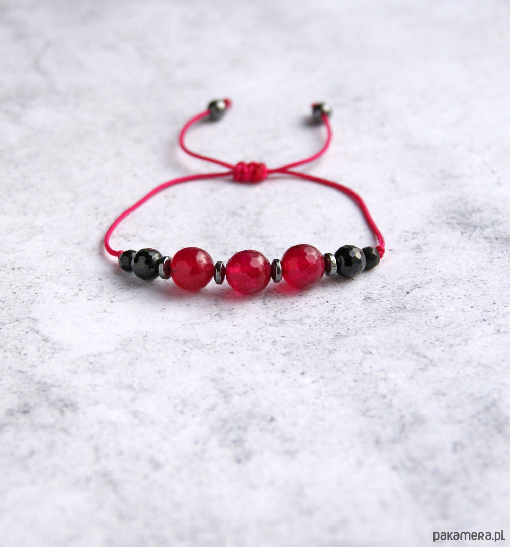 wykończenie (plecionka makramowa) sprawia, że można samodzielnie dostosować ich długość - będą odpowiednie na każdy nadgarstek (do 18cm). na końcach sznureczków umieszczone są drobne kuleczki hematytu.