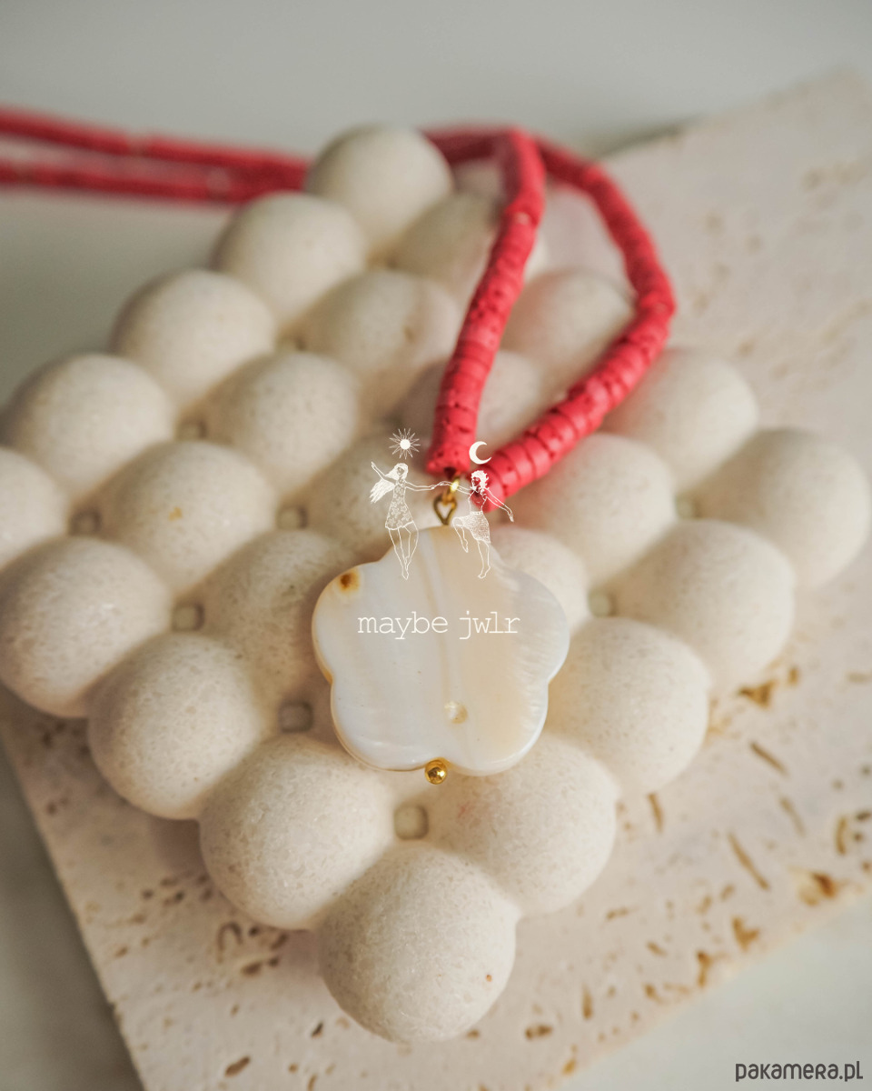 Zawieszka jest zrobiona z muszli rzeźbionej na wzór kwiatka o wymiarach 25x25mm