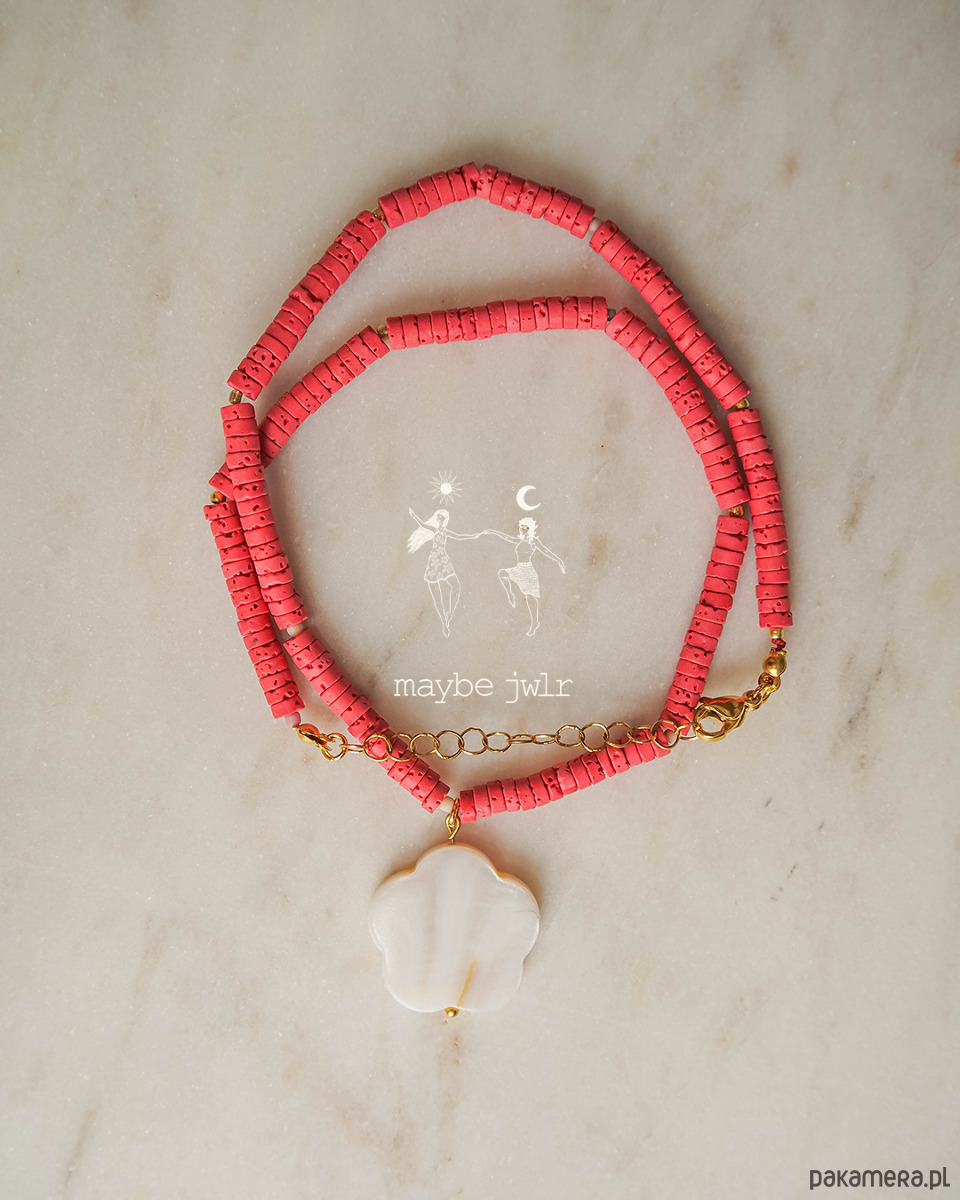Ten naszyjnik został wykonany ręcznie z barwionej na różowo lawy wulkanicznej, porowate kamienie w kształcie dysków są przeplatane drobnymi, złotymi koralikami TOHO.