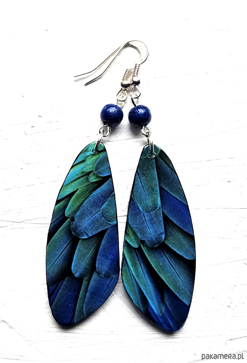 kolczyki drewniane, ozdobione metodą decoupage, dwustronne, starannie wykończone farbami akrylowymi i zabezpieczone wielokrotnie lakierem, bigle posrebrzane, długość kolczyków bez bigli: 6 cm, szerokość: 2 cm, bardzo lekkie