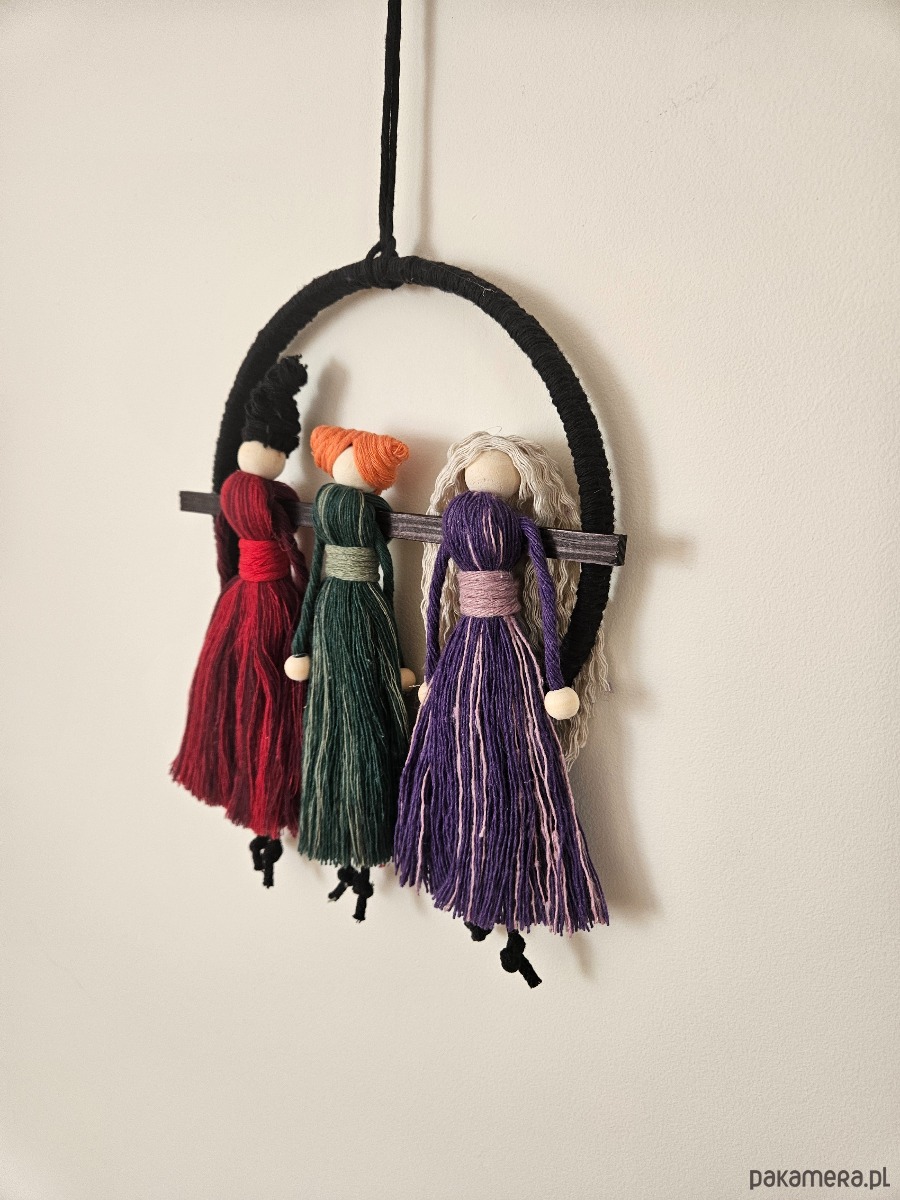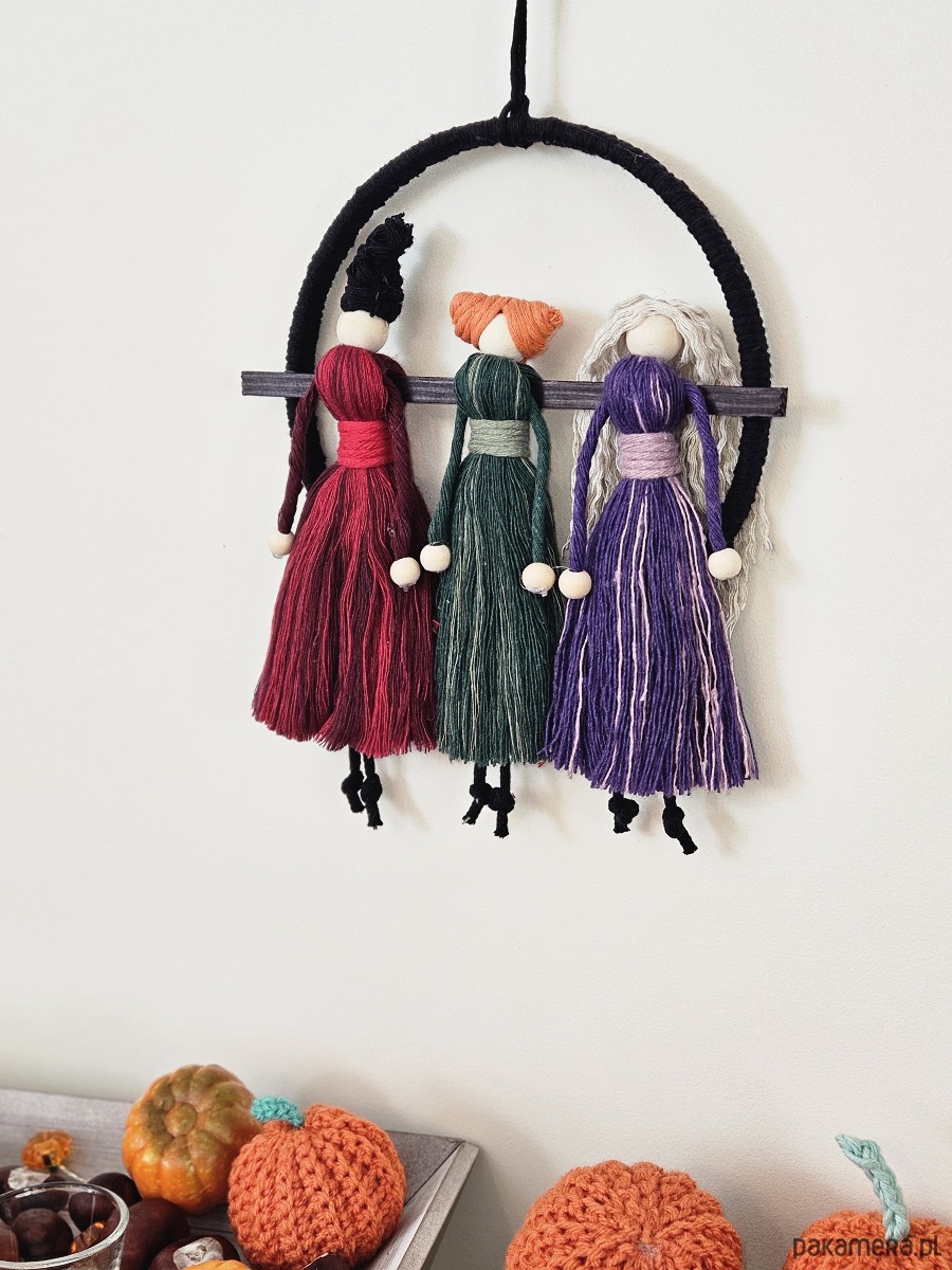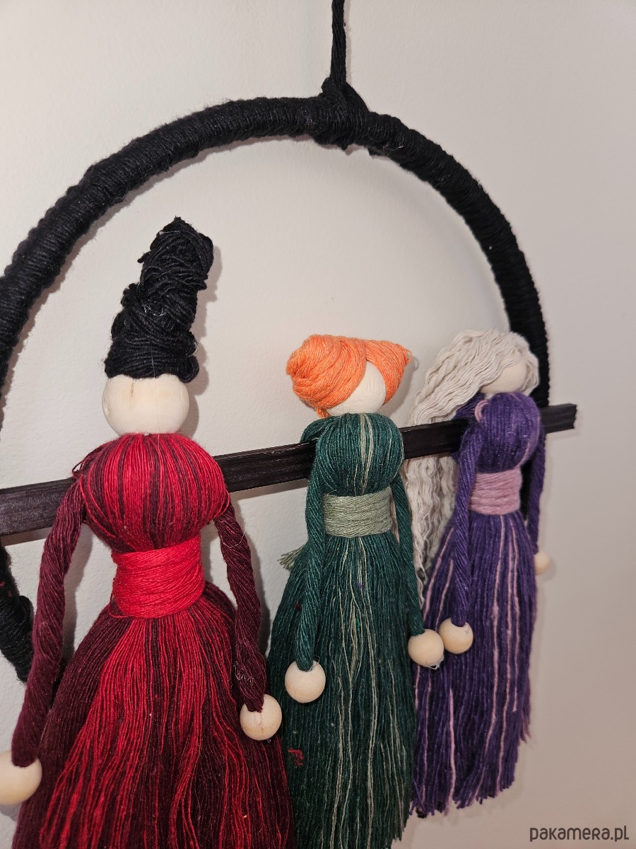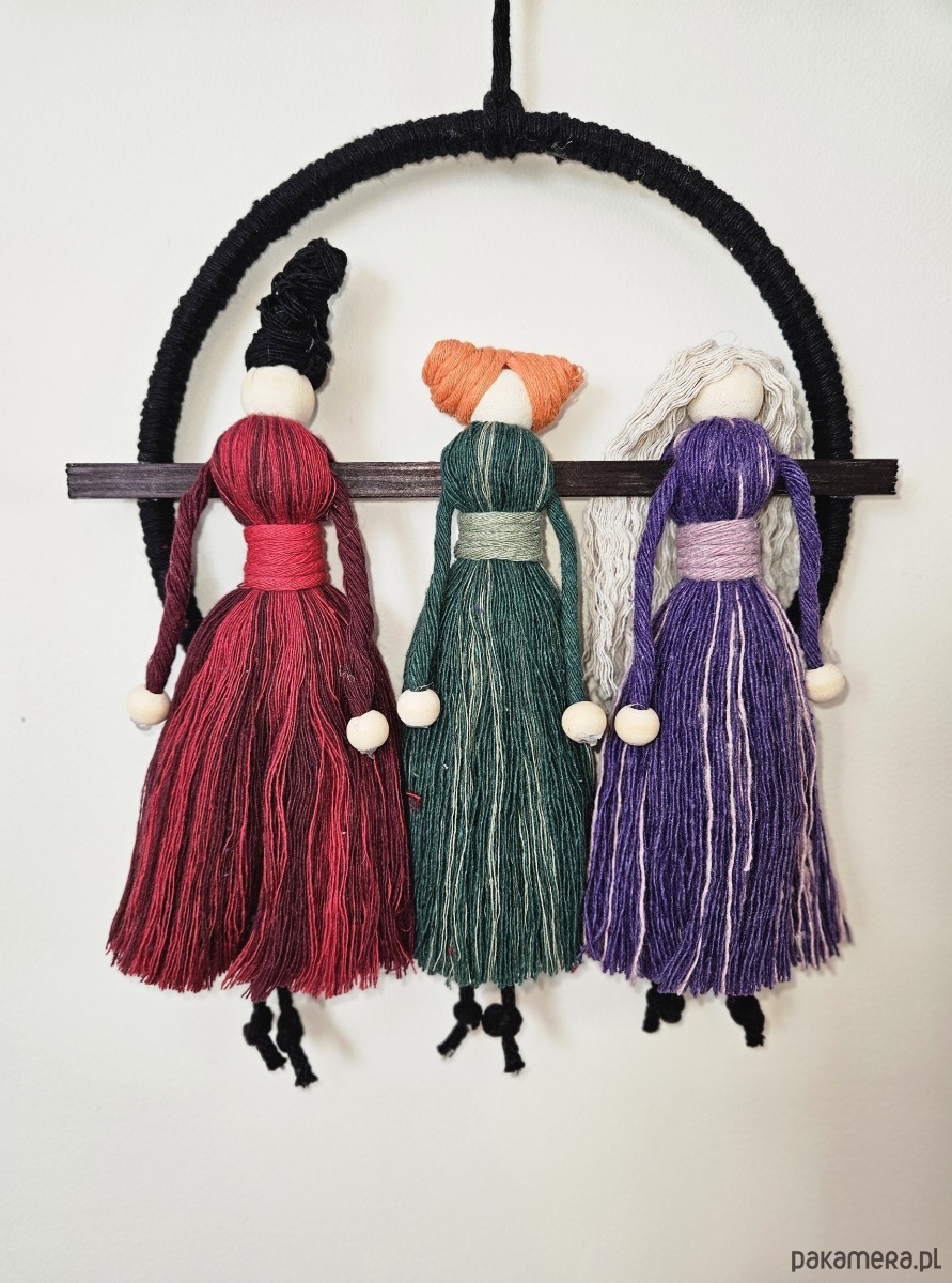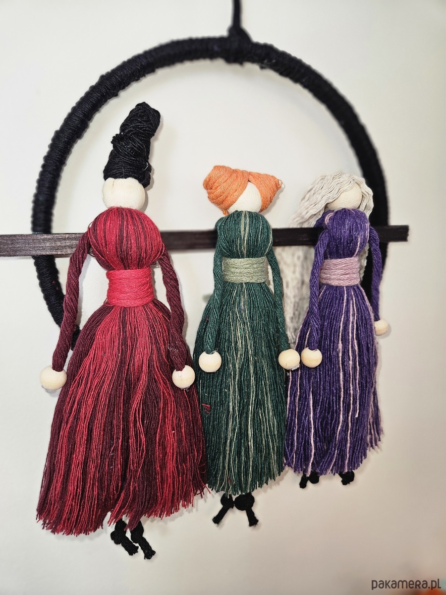 Trzy postacie wykonane zostały ręcznie z włóczki i drewnianych koralików, co nadaje im niepowtarzalny urok. Każda z sióstr ma charakterystyczny kolor sukni i fryzurę: