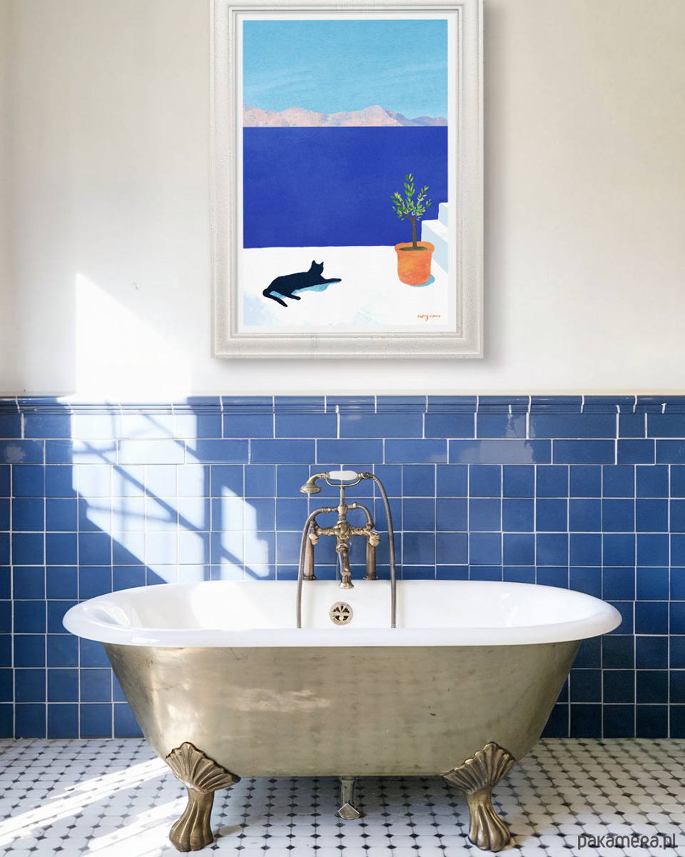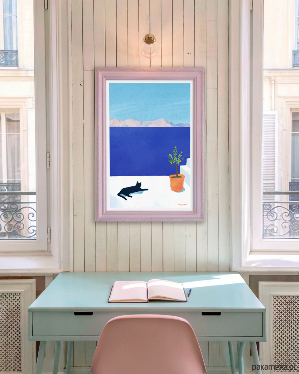 Chabrowa barwa wody, białe patio i czarny kot drzemiący w promieniach słońca. Wakacyjna grafika sprawi, że pogrążymy się w marzeniach o odprężającej podróży, a dodatkowo pięknie ozdobi każde wnętrze.