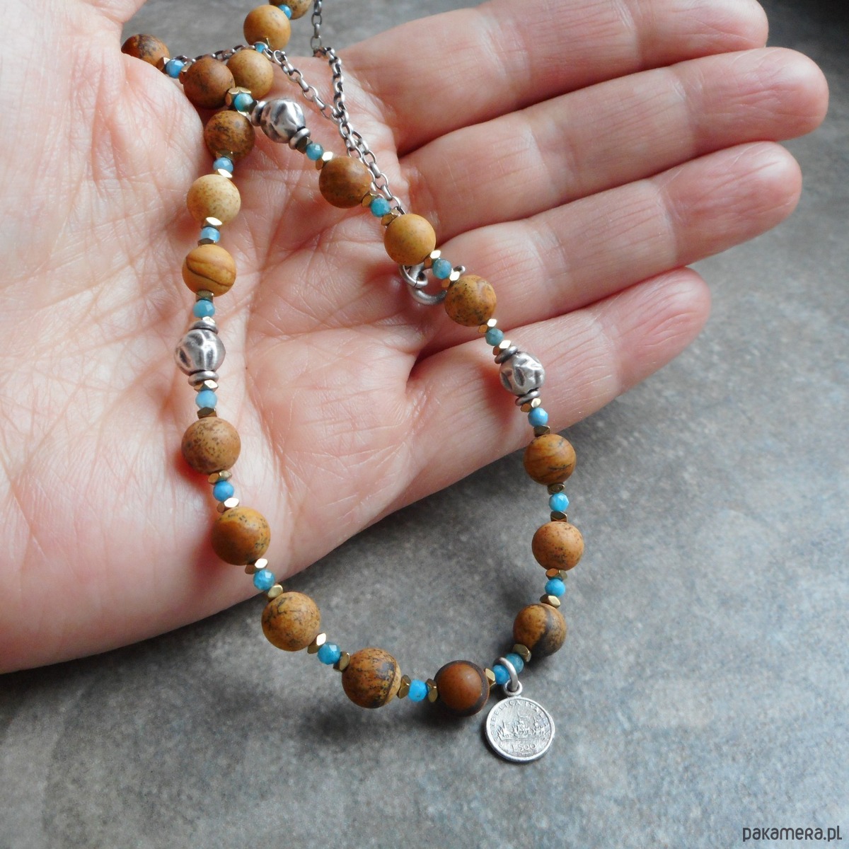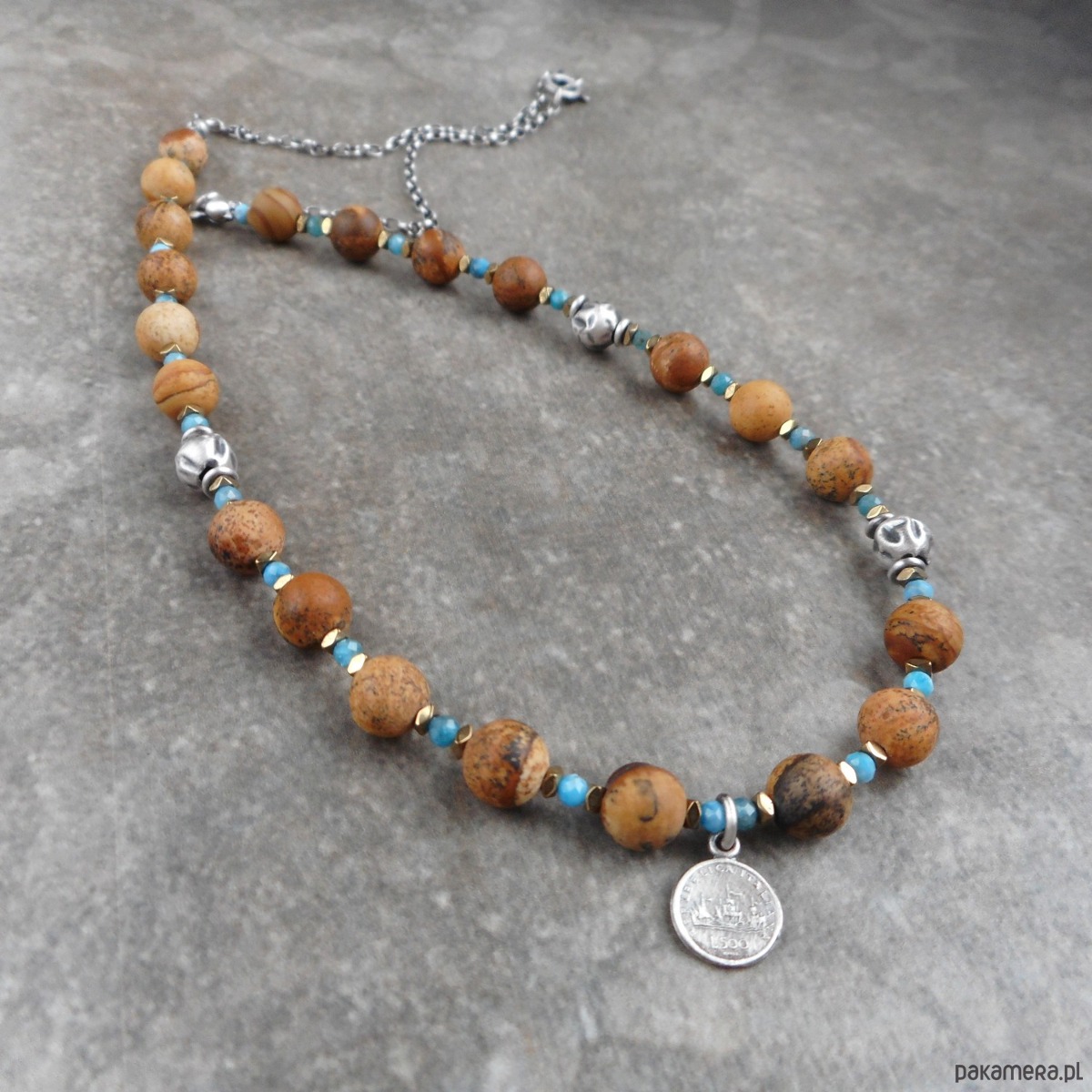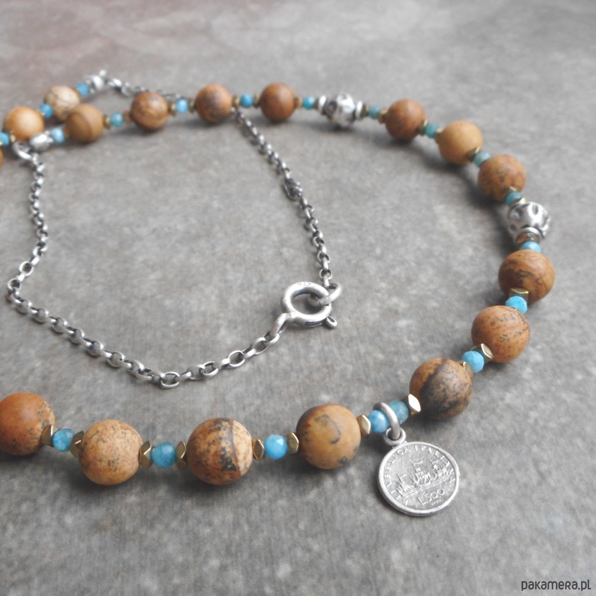 Bardzo kobiecy naszyjnik wykonany ze szlachetnego srebra i kamieni naturalnych; zestawione ze sobą kontrastowo brązy i błękity, ozdobione małą zawieszką w formie monety.