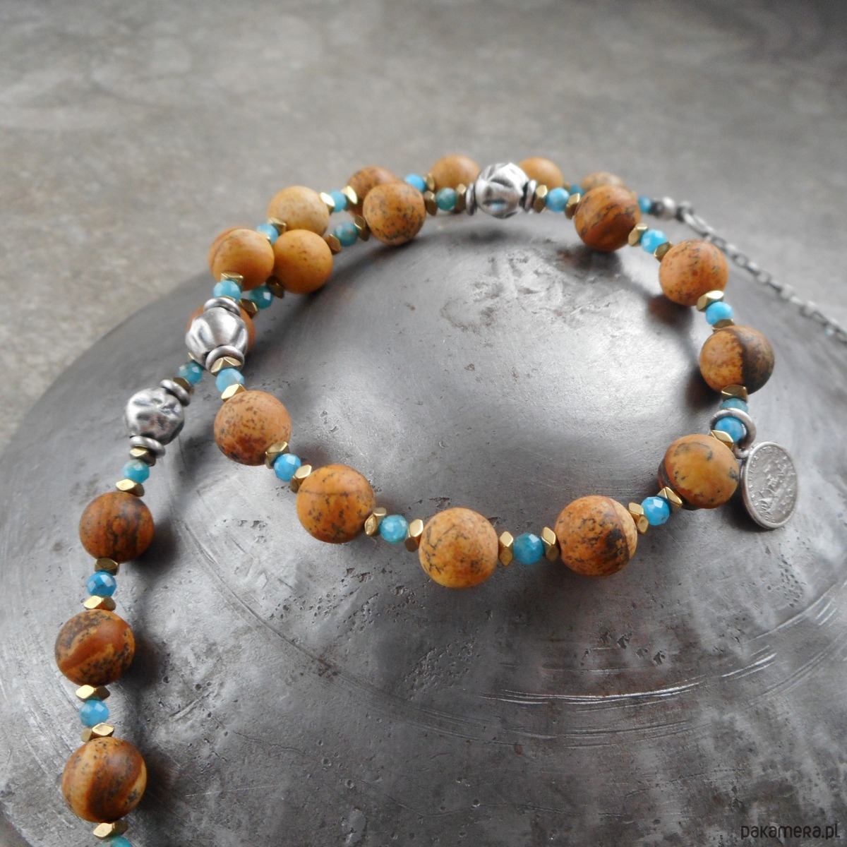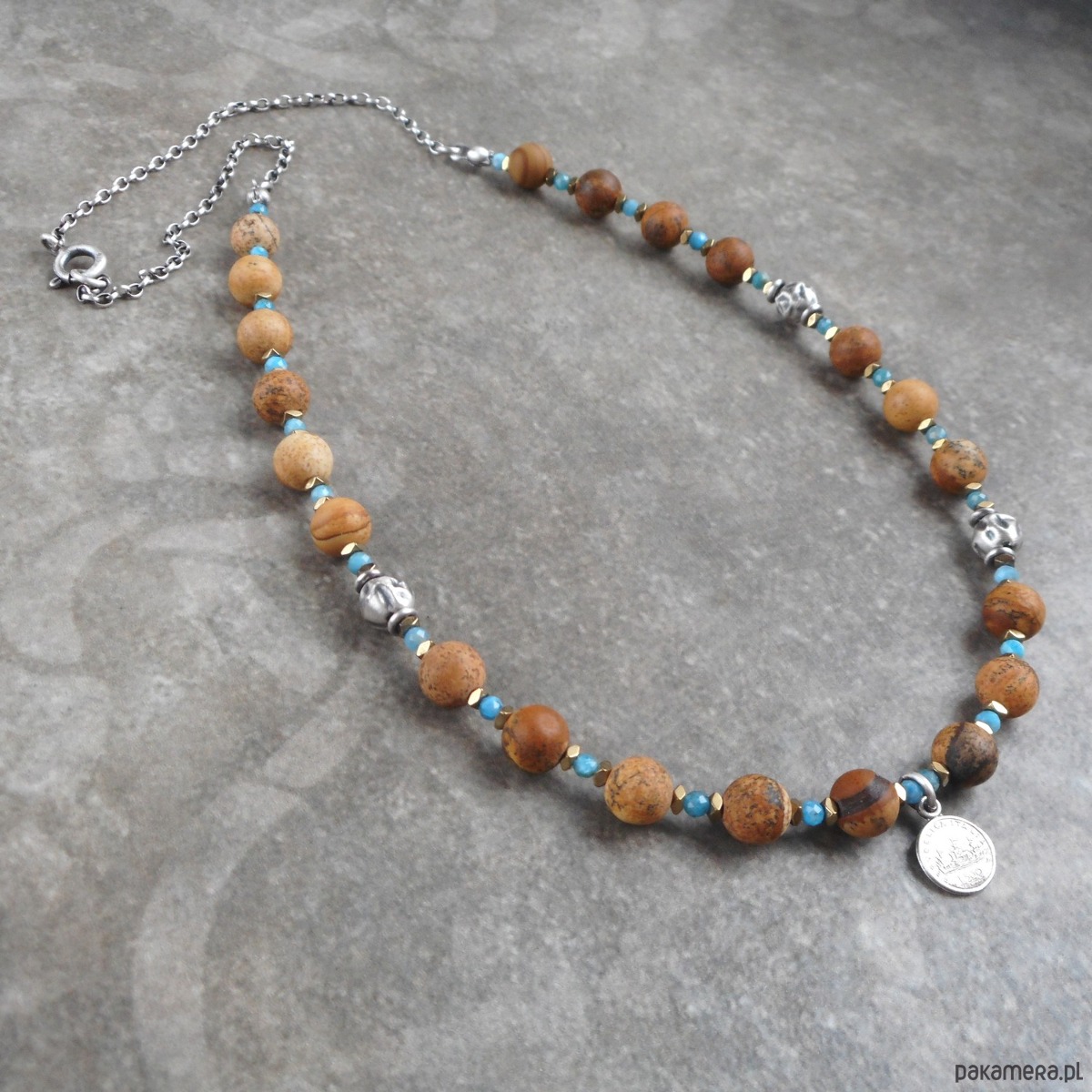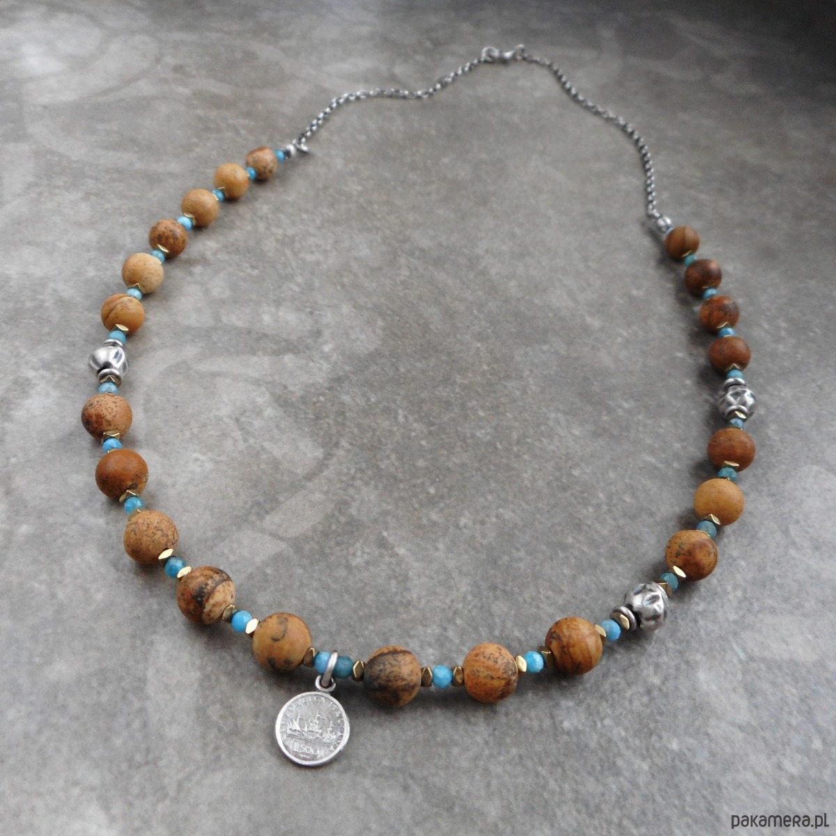 Bardzo kobiecy naszyjnik wykonany ze szlachetnego srebra i kamieni naturalnych; zestawione ze sobą kontrastowo brązy i błękity, ozdobione małą zawieszką w formie monety.