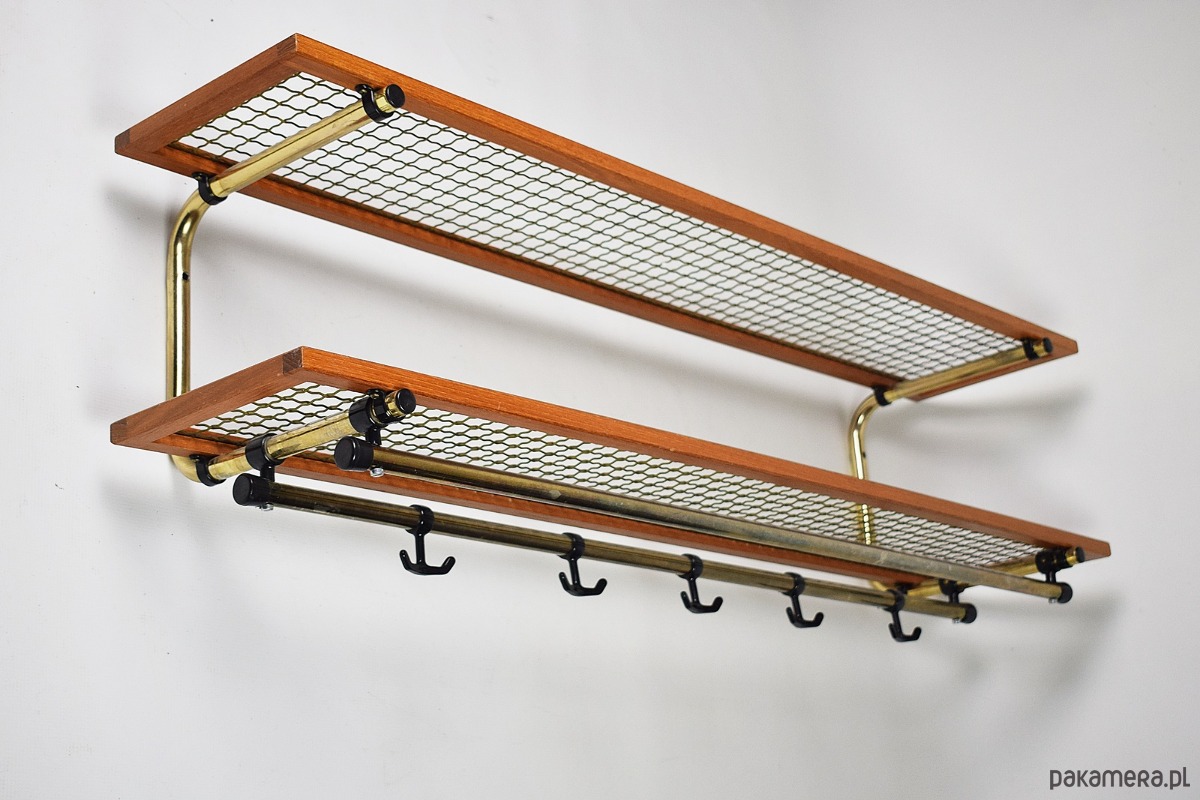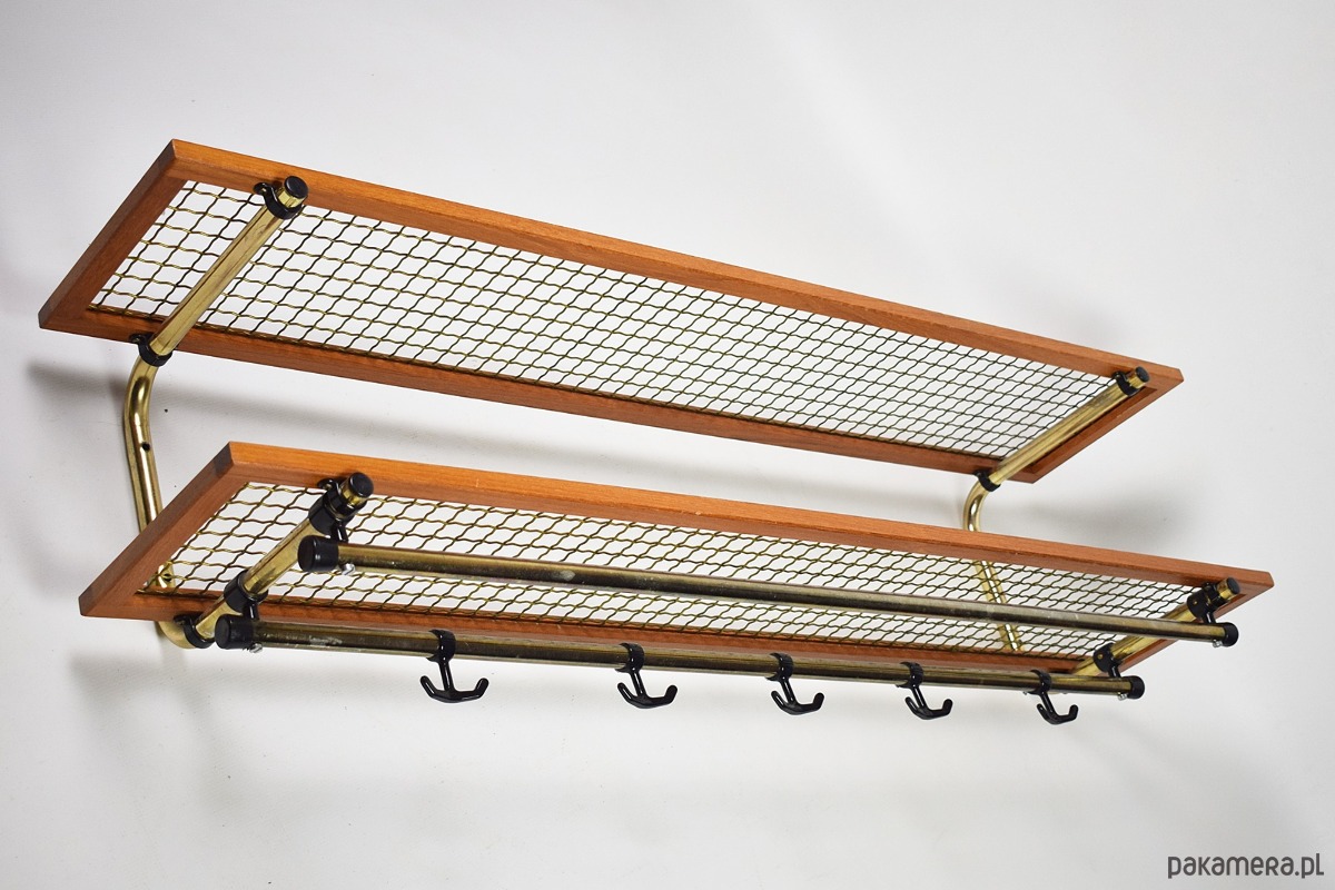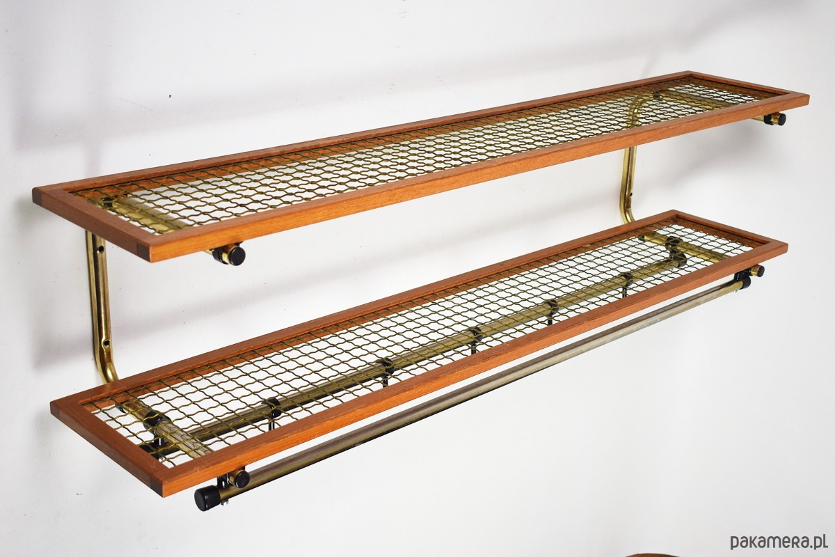 Ten wyjątkowy wieszak ścienny to ikona skandynawskiego wzornictwa z połowy XX wieku, łącząca szlachetne drewno teaku z elegancką konstrukcją w kolorze mosiądzu. Projekt typu „hatthylla” oferuje przemyślaną funkcjonalność: górna półka z charakterystycznym splotem żyłkowym jest idealna na nakrycia głowy, podczas gdy dolny drążek i zestaw przesuwnych haczyków zapewniają mnóstwo miejsca na płaszcze oraz akcesoria. Dzięki lekkiej wizualnie formie mebel doskonale odnajdzie się zarówno w klasycznych wnętrzach mid-century modern, jak i w nowoczesnych, minimalistycznych przedpokojach. Przedmiot zachowany w dobrym stanie vintage, z naturalną patyną podkreślającą jego autentyczne pochodzenie i ponadczasowy styl.