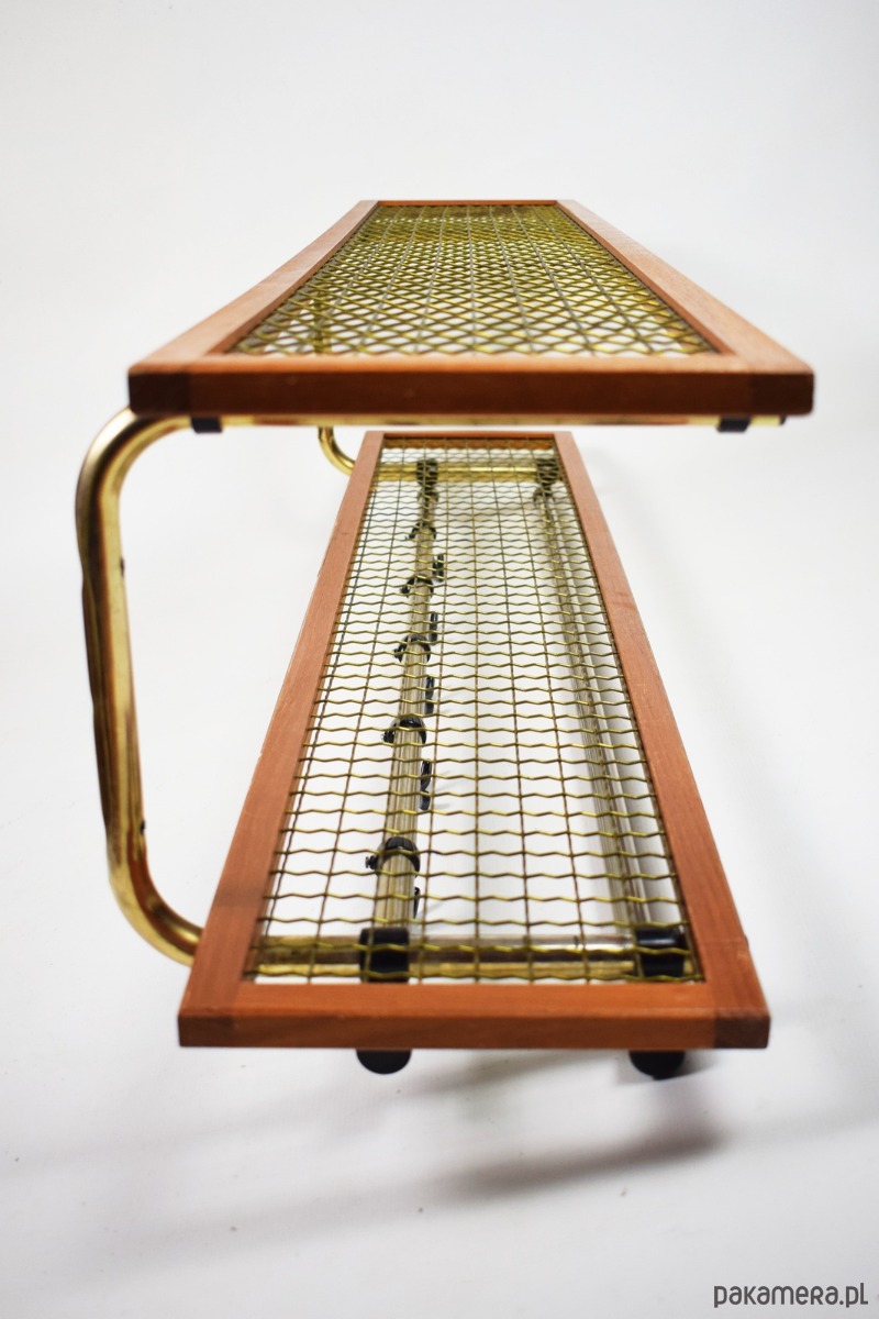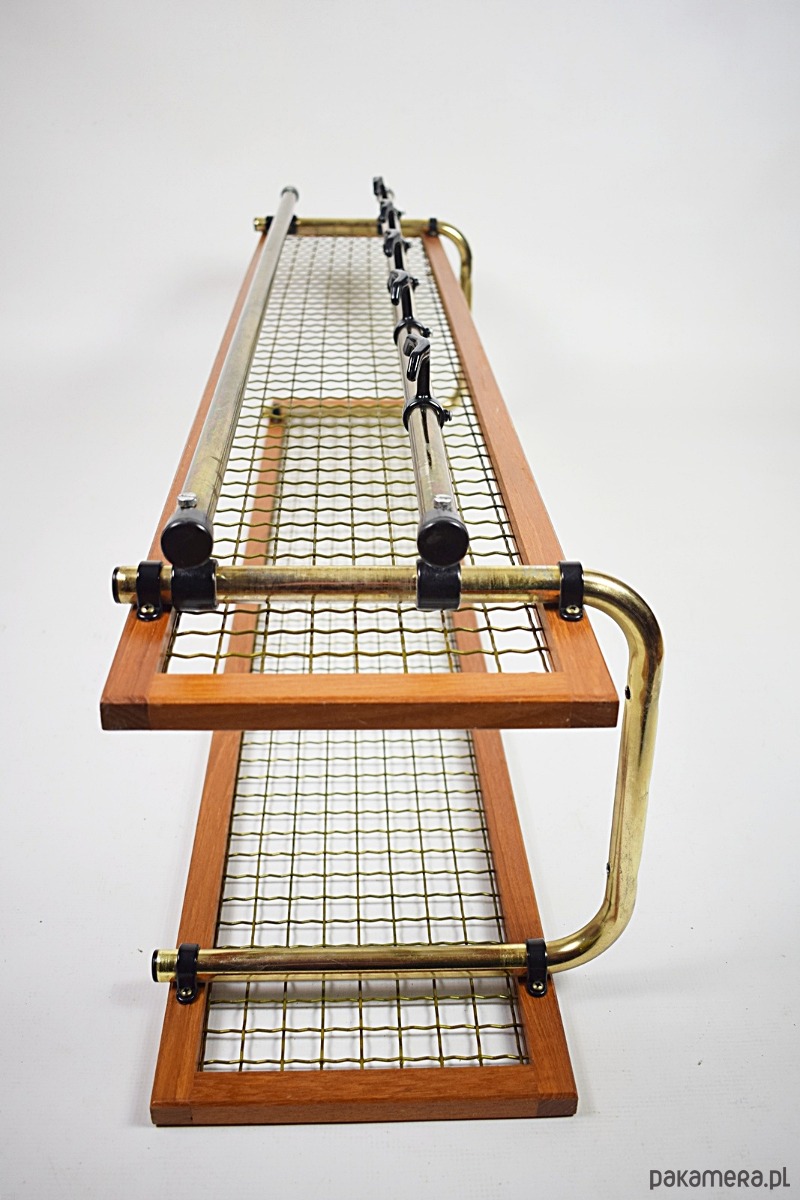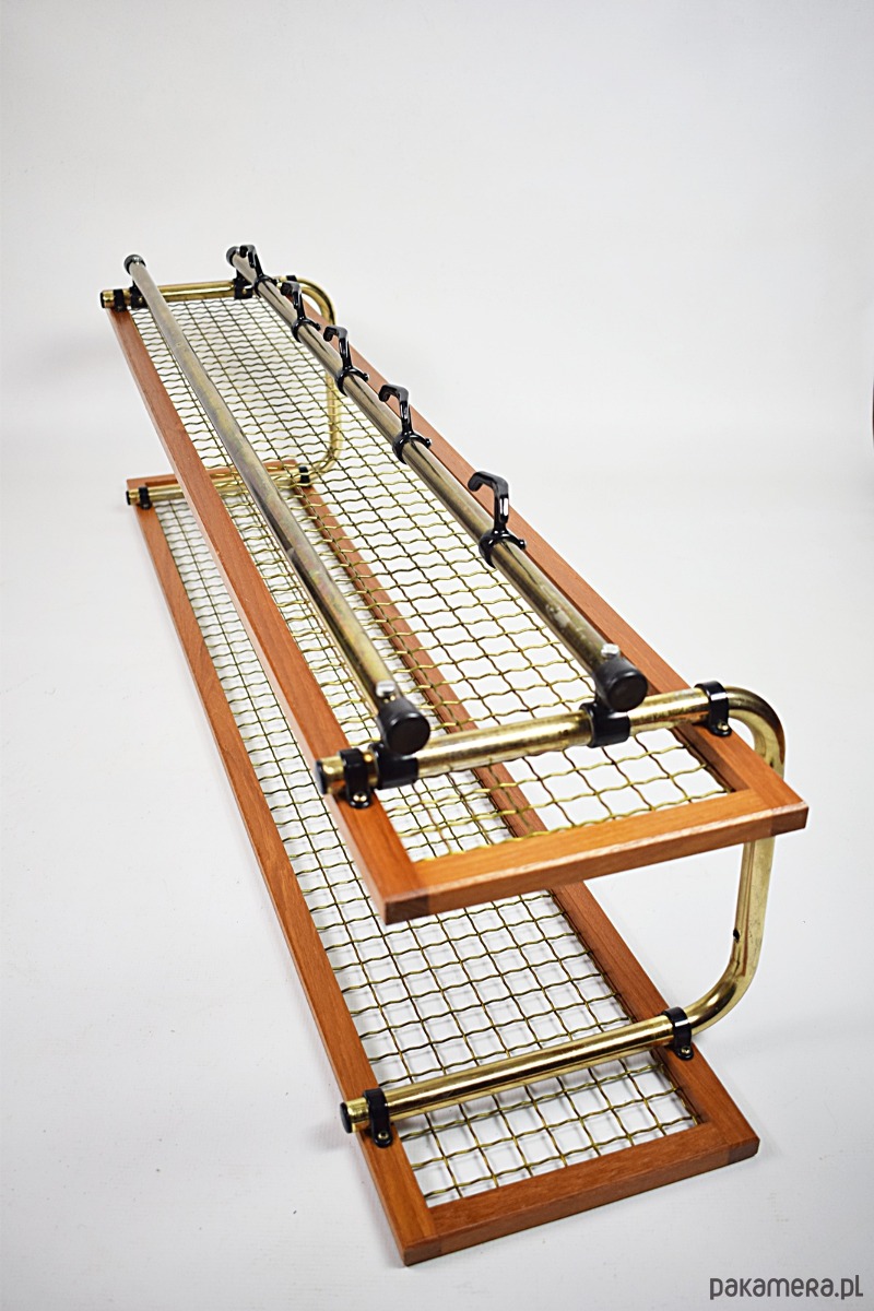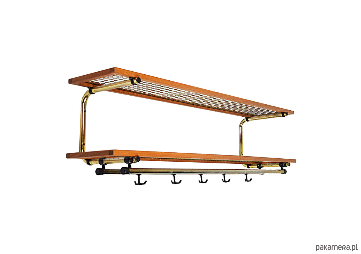 Ten wyjątkowy wieszak ścienny to ikona skandynawskiego wzornictwa z połowy XX wieku, łącząca szlachetne drewno teaku z elegancką konstrukcją w kolorze mosiądzu. Projekt typu „hatthylla” oferuje przemyślaną funkcjonalność: górna półka z charakterystycznym splotem żyłkowym jest idealna na nakrycia głowy, podczas gdy dolny drążek i zestaw przesuwnych haczyków zapewniają mnóstwo miejsca na płaszcze oraz akcesoria. Dzięki lekkiej wizualnie formie mebel doskonale odnajdzie się zarówno w klasycznych wnętrzach mid-century modern, jak i w nowoczesnych, minimalistycznych przedpokojach. Przedmiot zachowany w dobrym stanie vintage, z naturalną patyną podkreślającą jego autentyczne pochodzenie i ponadczasowy styl.