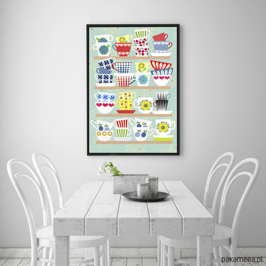 Plakat w stylu skandynawskim z autorską grafiką przedstawiającą kolekcję kubków. Zaprojektowany przez niemiecką artystkę Elisandrę Sevenstar.